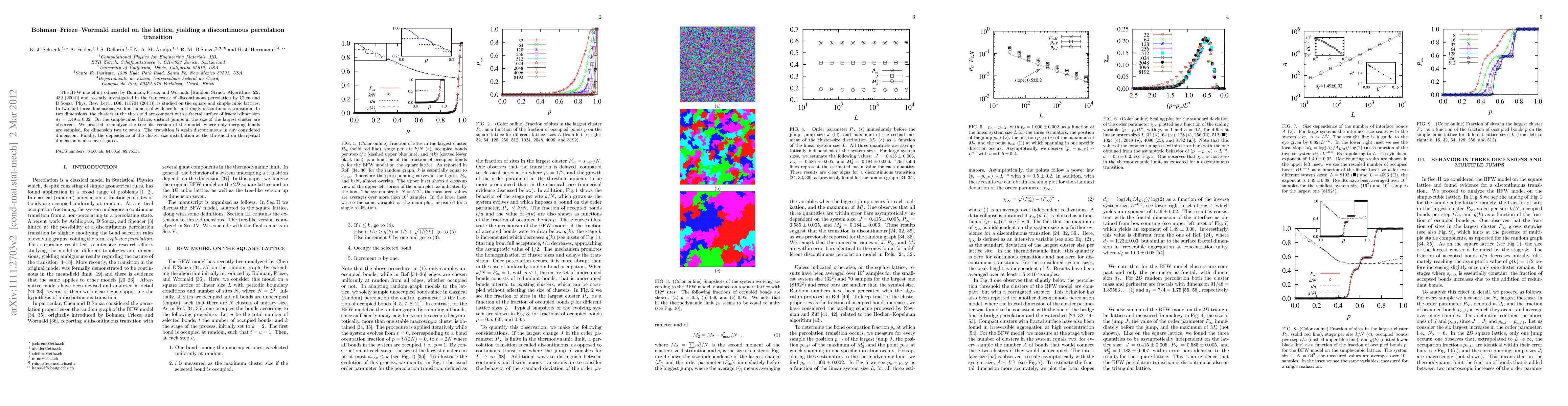 Researchers studied the BFW model on square and simple-cubic lattices in 2D and 3D, finding a strongly discontinuous percolation transition with compact clusters in 2D and distinct jumps in cluster size in 3D.