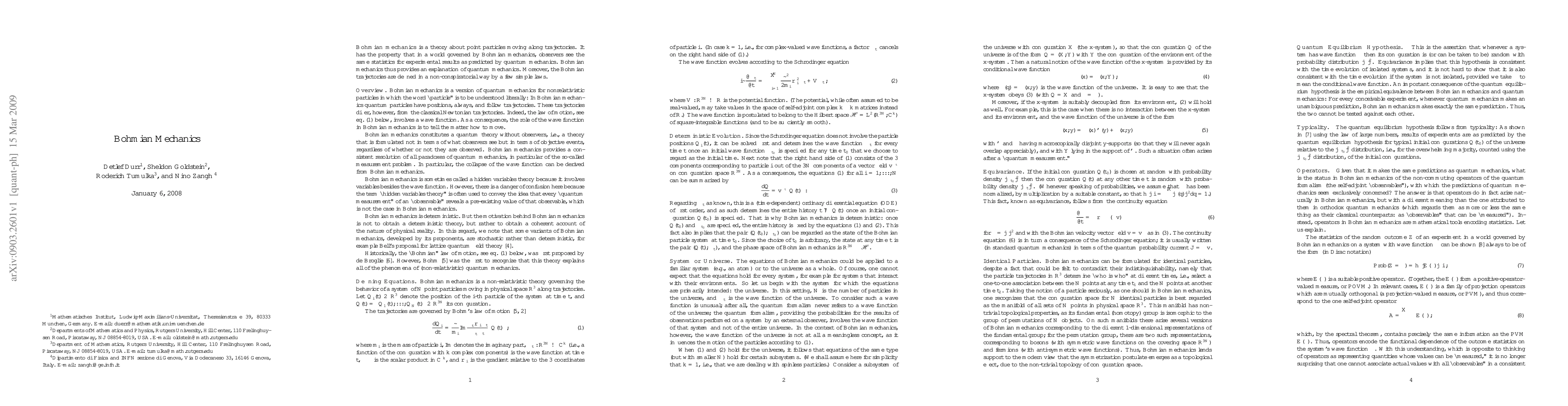 The paper discusses Bohmian mechanics, a theory explaining quantum mechanics through particle trajectories governed by simple laws, ensuring the same statistical predictions as quantum mechanics.