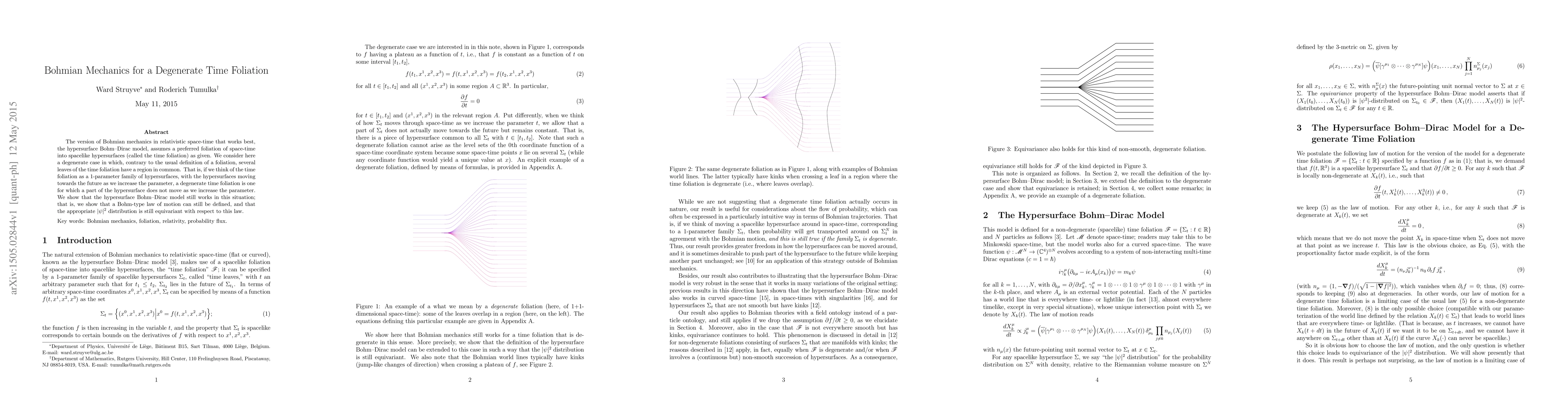 This paper explores the application of Bohmian mechanics in a degenerate time foliation, where some hypersurfaces do not move forward. It demonstrates that the hypersurface Bohm-Dirac model remains functional, maintaining a Bohmian law of motion and an equivariant $|\psi|^2$ distribution.