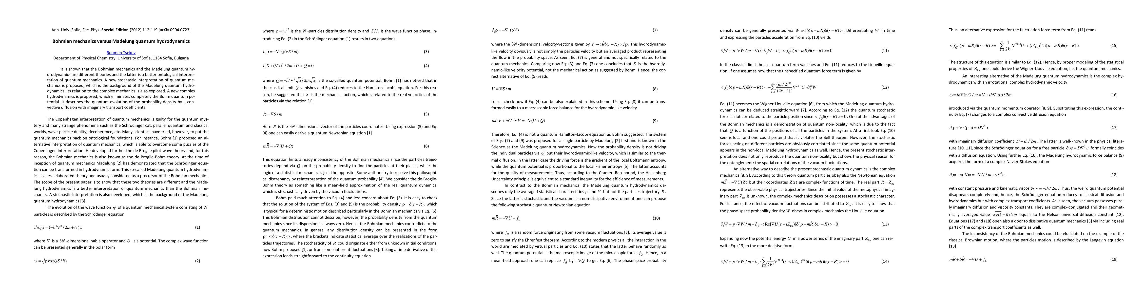 This paper argues that Bohmian mechanics and Madelung quantum hydrodynamics are distinct theories, with the latter providing a superior ontological interpretation of quantum mechanics. It introduces a new stochastic interpretation and proposes a new complex hydrodynamics that eliminates the Bohm quantum potential, describing quantum evolution through convective diffusion with imaginary transport coefficients.