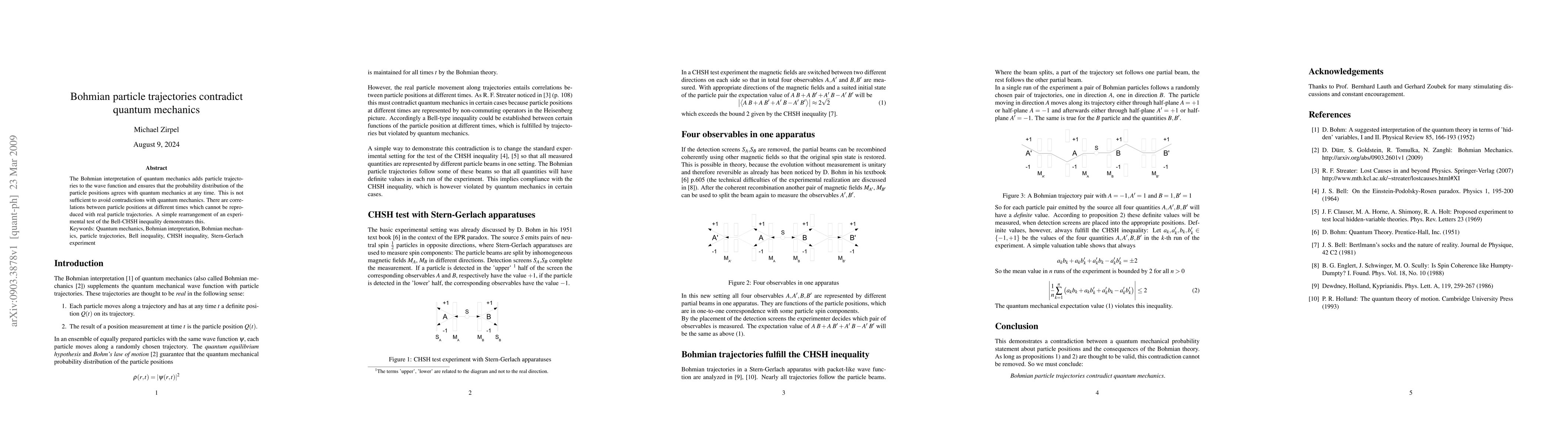 The Bohmian interpretation introduces particle trajectories that align with quantum mechanics' probability distributions but fails to reproduce correlations between particle positions at different times, contradicting the predictions of quantum mechanics. This is exemplified by a modified Bell-CHSH inequality test.