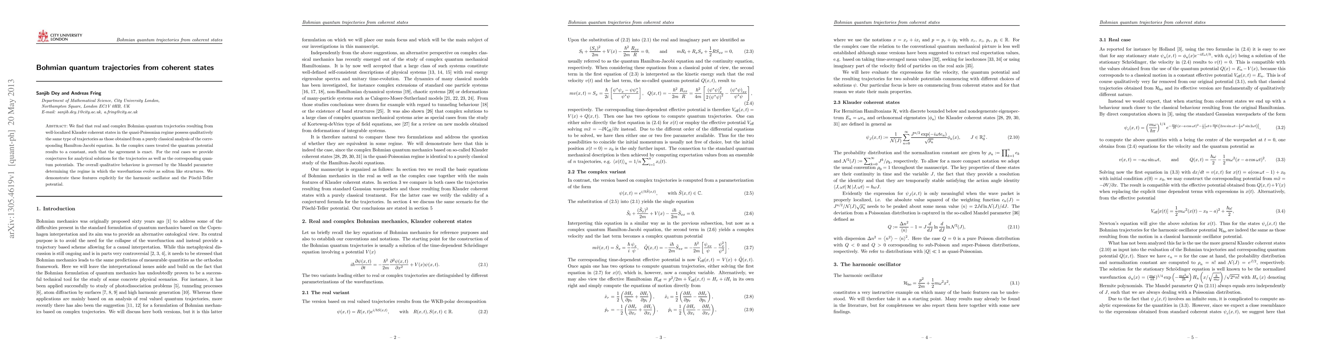 This paper investigates Bohmian quantum trajectories originating from coherent states, showing they closely resemble classical trajectories derived from Hamilton-Jacobi equations. For complex cases, the quantum potential is constant, leading to exact agreement, while real cases propose conjectures for analytical solutions. The study highlights the role of the Mandel parameter in determining the soliton-like evolution of wavefunctions, exemplified in the harmonic oscillator and Pöschl-Teller potential.