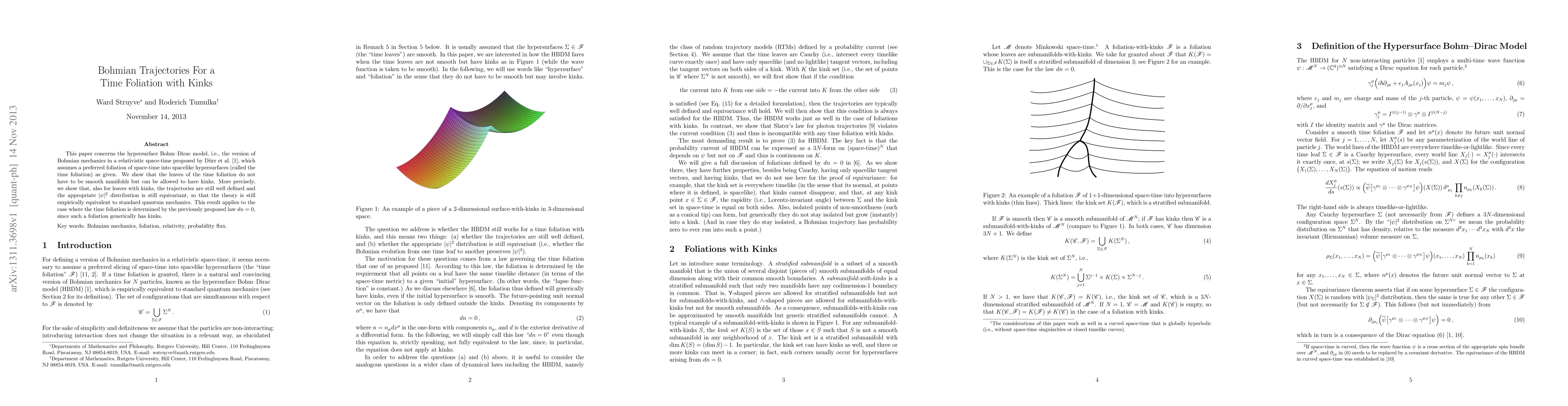 This paper concerns the hypersurface Bohm-Dirac model, i.e., the version of Bohmian mechanics in a relativistic space-time proposed by D\"urr et al. [1], which assumes a preferred foliation of space-time into spacelike hypersurfaces (called the time foliation) as given. We show that the leaves of the time foliation do not have to be smooth manifolds but can be allowed to have kinks. More precisely, we show that, also for leaves with kinks, the trajectories are still well defined and the appropriate $|\psi|^2$ distribution is still equivariant, so that the theory is still empirically equivalent to standard quantum mechanics. This result applies to the case where the time foliation is determined by the previously proposed law $dn=0$, since such a foliation generically has kinks.