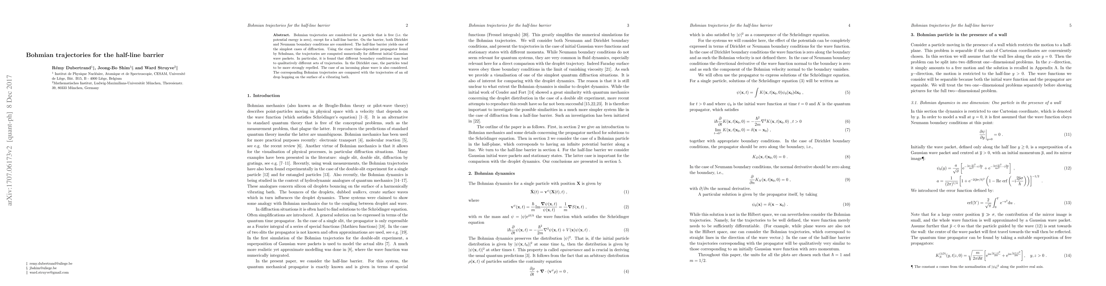 Bohmian trajectories are considered for a particle that is free (i.e. the potential energy is zero), except for a half-line barrier. On the barrier, both Dirichlet and Neumann boundary conditions are considered. The half-line barrier yields one of the simplest cases of diffraction. Using the exact time-dependent propagator found by Schulman, the trajectories are computed numerically for different initial Gaussian wave packets. In particular, it is found that different boundary conditions may lead to qualitatively different sets of trajectories. In the Dirichlet case, the particles tend to be more strongly repelled. The case of an incoming plane wave is also considered. The corresponding Bohmian trajectories are compared with the trajectories of an oil drop hopping on the surface of a vibrating bath.