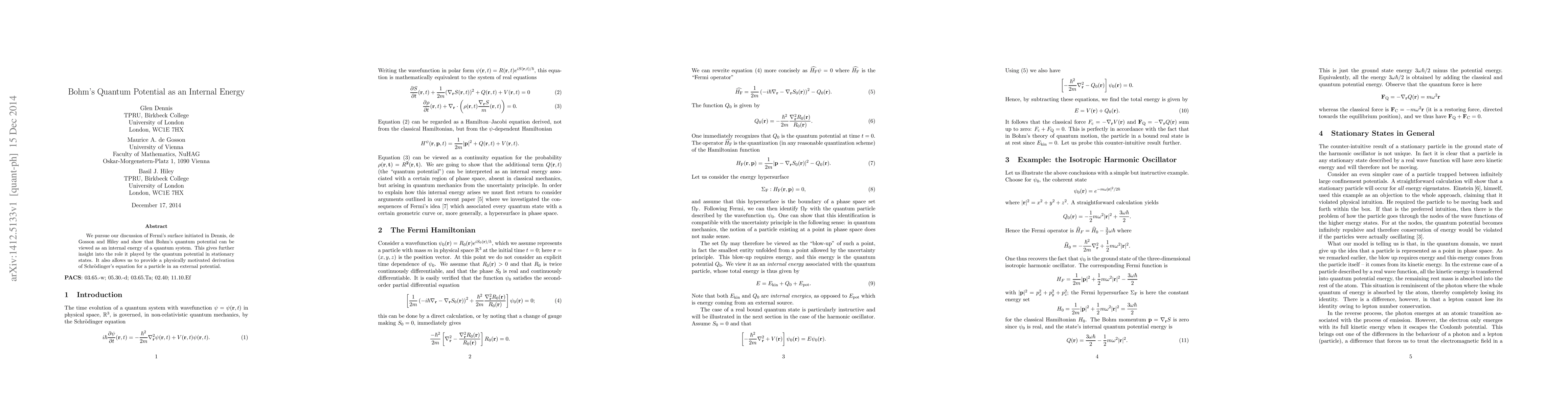 We pursue our discussion of Fermi's surface initiated in Dennis, de Gosson and Hiley and show that Bohm's quantum potential can be viewed as an internal energy of a quantum system. This gives further insight into the role it played by the quantum potential in stationary states. It also allows us to provide a physically motivated derivation of Schr\"odinger's equation for a particle in an external potential.