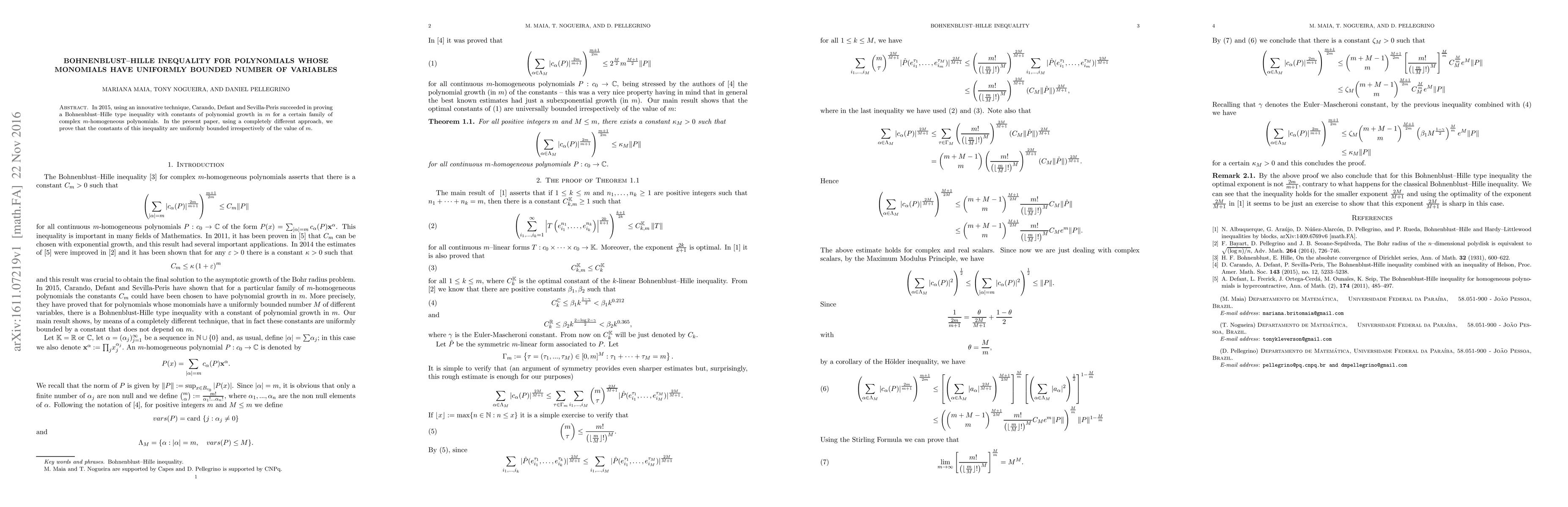 In 2015, using an innovative technique, Carando, Defant and Sevilla-Peris succeeded in proving a Bohnenblust--Hille type inequality with constants of polynomial growth in $m$ for a certain family of complex $m$-homogeneous polynomials. In the present paper, using a completely different approach, we prove that the constants of this inequality are uniformly bounded irrespectively of the value of $m$.