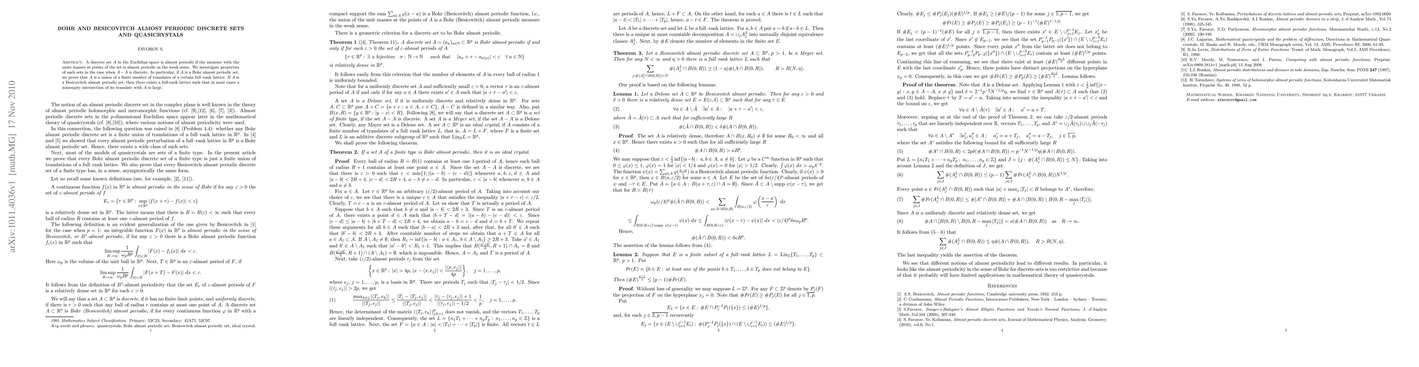 This paper explores the properties of Bohr and Besicovitch almost periodic discrete sets in Euclidean space, proving that Bohr almost periodic sets are unions of finite translates of full-rank lattices, while Besicovitch almost periodic sets exhibit large intersections with full-rank lattice translates in most cases.