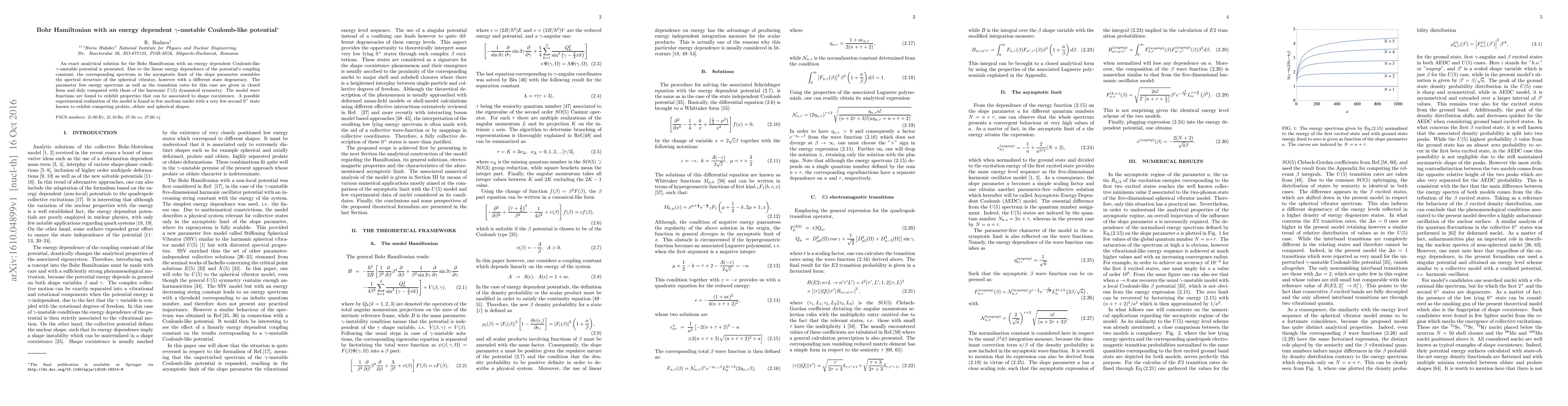 This paper presents an exact analytical solution for the Bohr Hamiltonian incorporating an energy-dependent Coulomb-like, u201cgammau201d-unstable potential. The model's spectrum in the asymptotic limit mirrors the spherical vibrator's, but with varying state degeneracy. Closed-form expressions for the parameter-free energy spectrum and transition rates are provided, contrasted with the harmonic U(5) dynamical symmetry. The wave functions suggest shape coexistence, with potential experimental realization in medium nuclei displaying competing prolate, oblate, and spherical shapes.