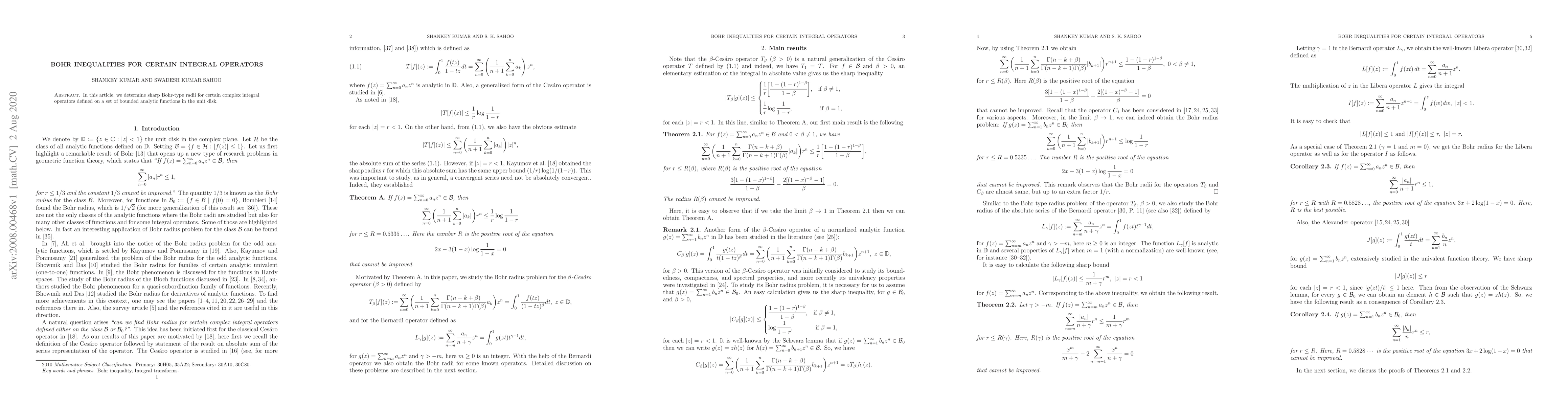 This paper establishes precise Bohr-type radii for specific complex integral operators acting on bounded analytic functions within the unit disk, aiming to find the smallest disk in which these operators preserve analyticity.
