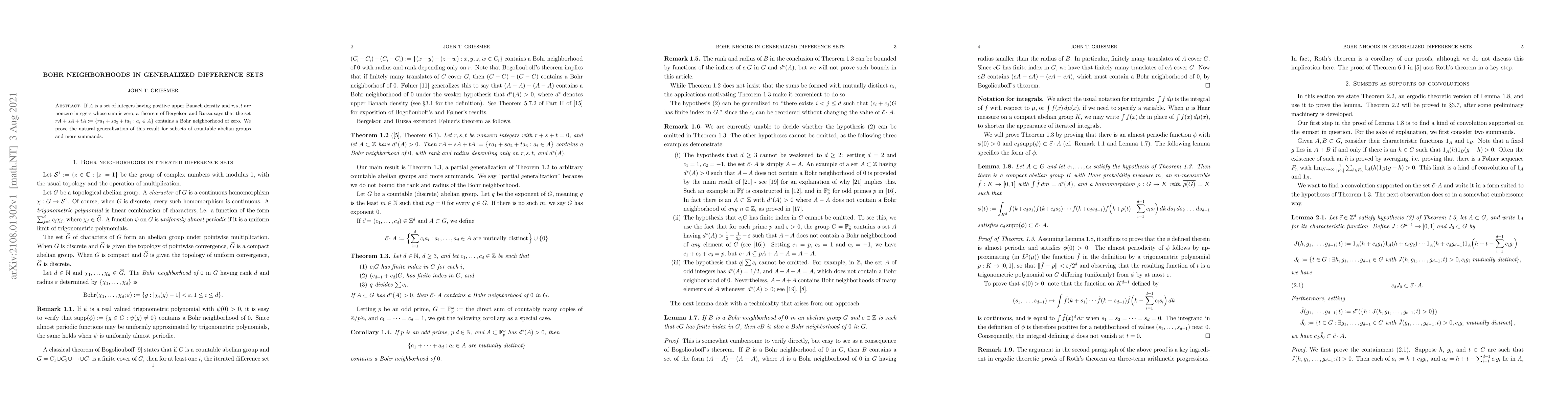 If $A$ is a set of integers having positive upper Banach density and $r,s,t$ are nonzero integers whose sum is zero, a theorem of Bergelson and Ruzsa says that the set $rA+sA+tA:=\{ra_1+sa_2+ta_3:a_i\in A\}$ contains a Bohr neighborhood of zero. We prove the natural generalization of this result for subsets of countable abelian groups and more summands.