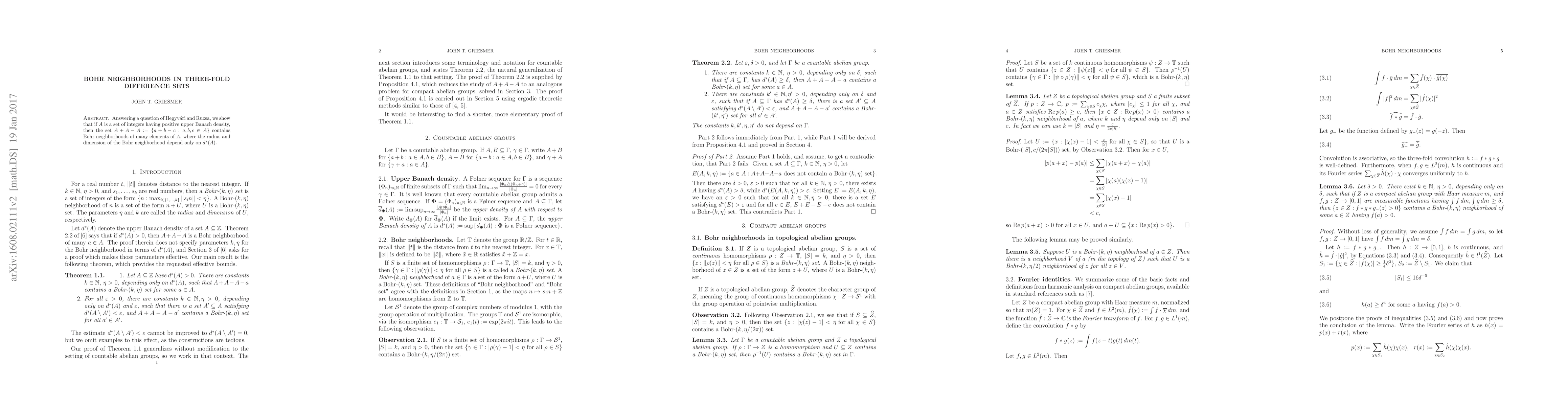 Answering a question of Hegyv\'ari and Ruzsa , we show that if A is a set of integers having positive upper Banach density, then the set A+A-A:= {a+b-c: a, b, c are in A} contains Bohr neighborhoods of many elements of A, where the radius and dimension of the Bohr neighborhood depend only the upper Banach density of A.