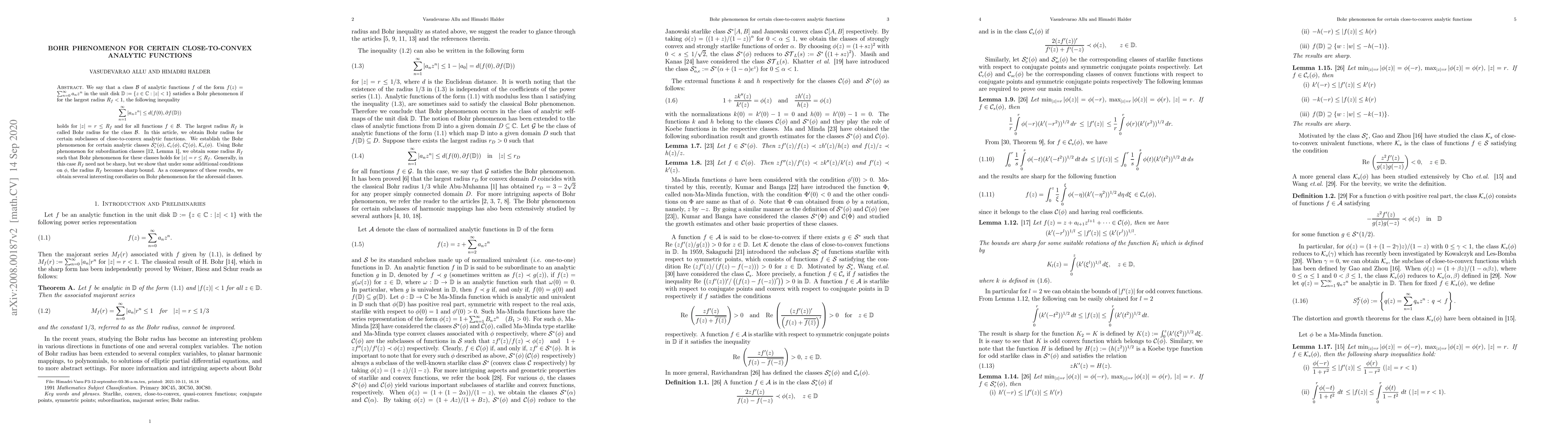 The paper presents detailed derivations and proofs for the Bohr radii of specific subclasses of close-to-convex analytic functions, extending previous work on the Bohr phenomenon.