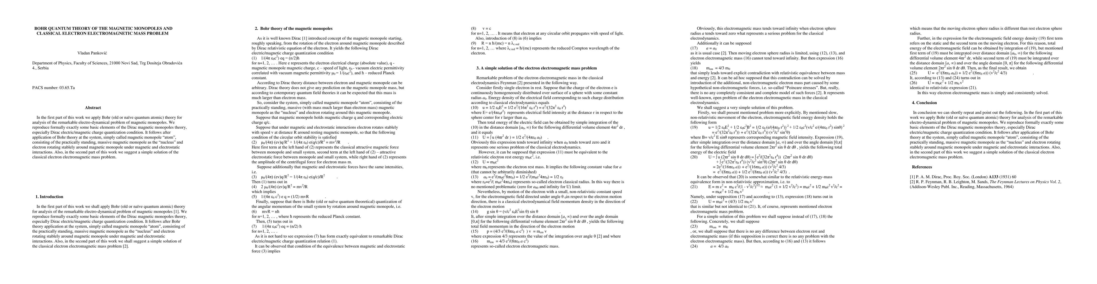 This paper applies Bohr's quantum theory to analyze magnetic monopoles, reproducing key elements of Dirac's monopole theory, and proposes a solution to the classical electron's electromagnetic mass problem.