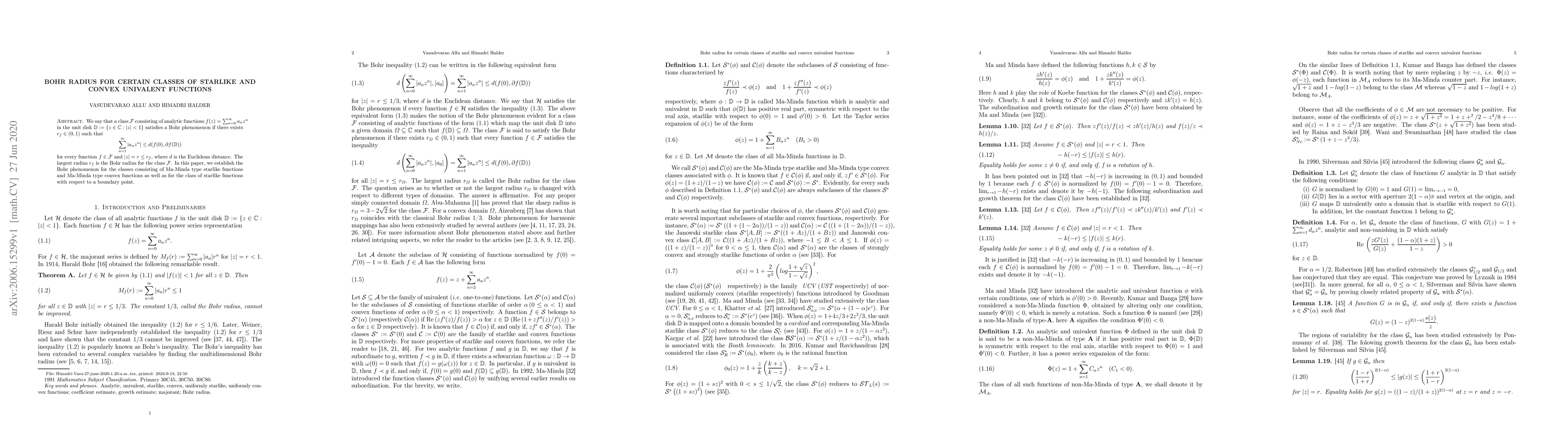 We say that a class $\mathcal{F}$ consisting of analytic functions $f(z)=\sum_{n=0}^{\infty} a_{n}z^{n}$ in the unit disk $\mathbb{D}:=\{z\in \mathbb{C}: |z|<1\}$ satisfies a Bohr phenomenon if there exists $r_{f} \in (0,1)$ such that $$ \sum_{n=1}^{\infty} |a_{n}z^{n}|\leq d(f(0),\partial f(\mathbb{D})) $$ for every function $f \in \mathcal{F}$ and $|z|=r\leq r_{f}$, where $d$ is the Euclidean distance. The largest radius $r_{f}$ is the Bohr radius for the class $\mathcal{F}$. In this paper, we establish the Bohr phenomenon for the classes consisting of Ma-Minda type starlike functions and Ma-Minda type convex functions as well as for the class of starlike functions with respect to a boundary point.
