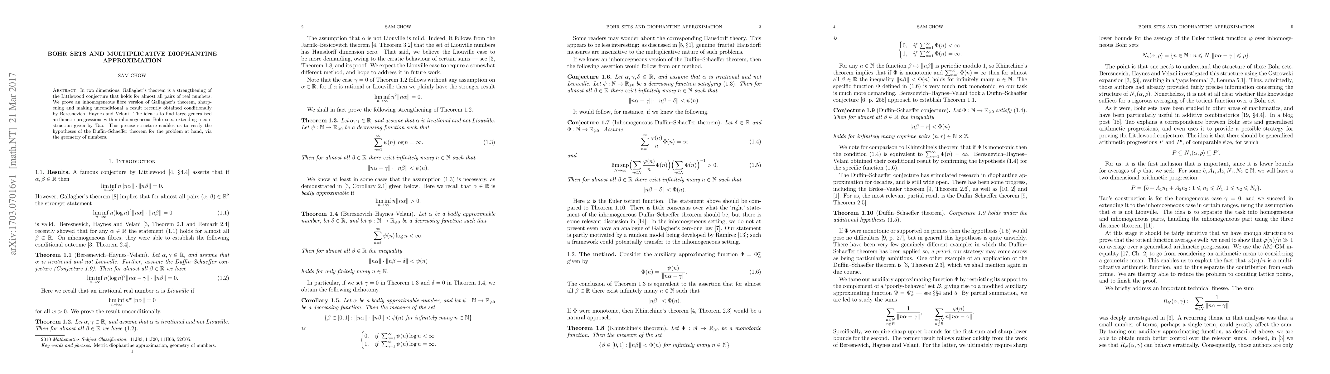 In two dimensions, Gallagher's theorem is a strengthening of the Littlewood conjecture that holds for almost all pairs of real numbers. We prove an inhomogeneous fibre version of Gallagher's theorem, sharpening and making unconditional a result recently obtained conditionally by Beresnevich, Haynes and Velani. The idea is to find large generalised arithmetic progressions within inhomogeneous Bohr sets, extending a construction given by Tao. This precise structure enables us to verify the hypotheses of the Duffin--Schaeffer theorem for the problem at hand, via the geometry of numbers.