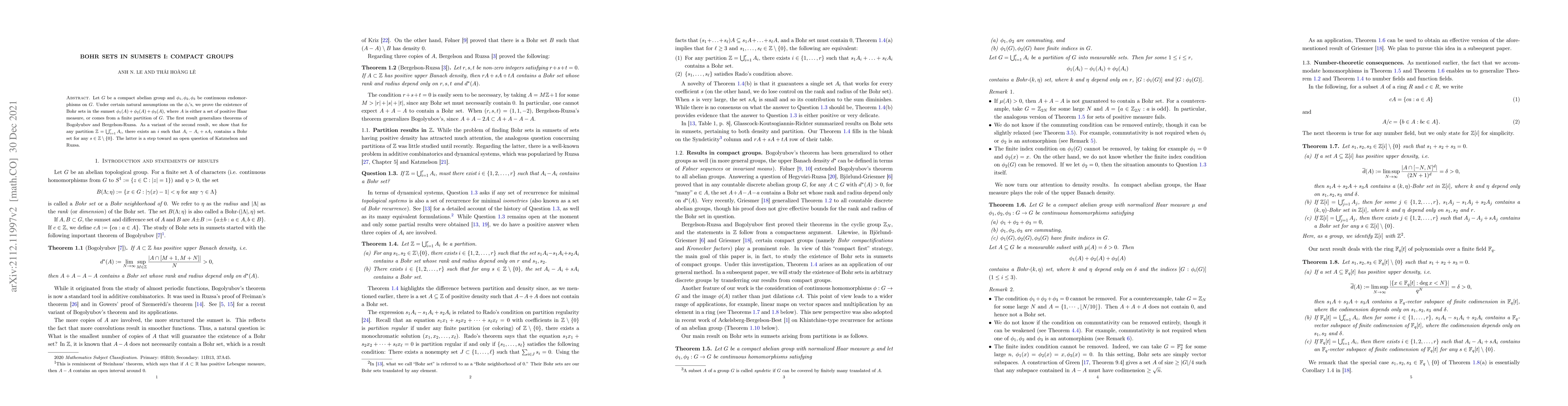 This paper proves the existence of Bohr sets in sumsets formed by continuous endomorphisms of a compact abelian group, generalizing previous results and addressing an open question related to the structure of partitions in $\mathbb{Z}$. The findings extend theorems from Bogolyubov and Bergelson-Ruzsa.