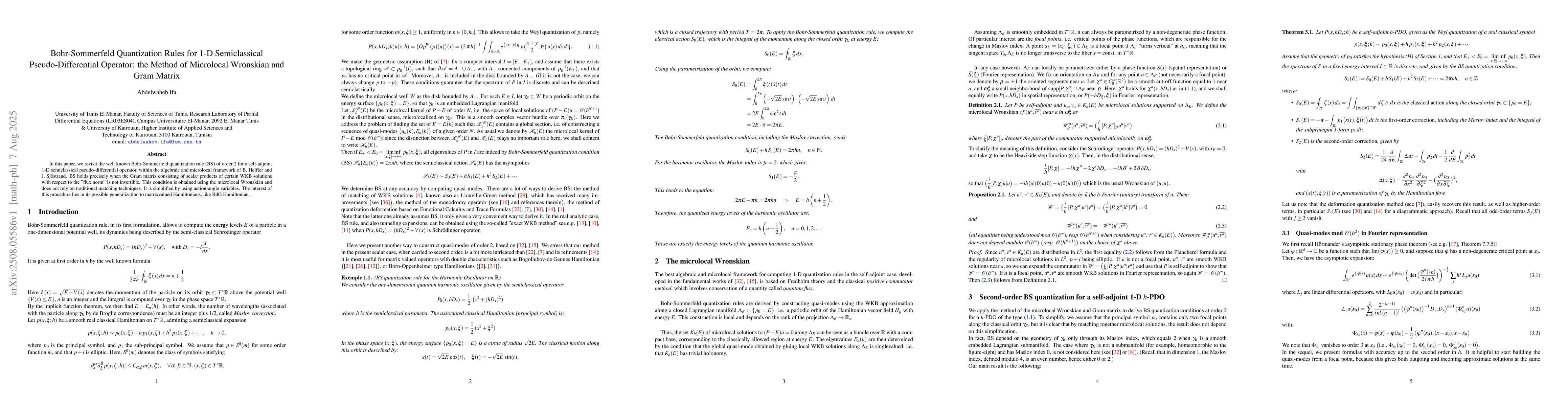 In this paper, we revisit the well known Bohr-Sommerfeld quantization rule (BS) of order 2 for a self-adjoint 1-D semiclassical pseudo-differential operator, within the algebraic and microlocal framework of B. Helffer and J. Sj\"{o}strand. BS holds precisely when the Gram matrix consisting of scalar products of certain WKB solutions with respect to the "flux norm" is not invertible. This condition is obtained using the microlocal Wronskian and does not rely on traditional matching techniques. It is simplified by using action-angle variables. The interest of this procedure lies in its possible generalization to matrixvalued Hamiltonians, like BdG Hamiltonian.