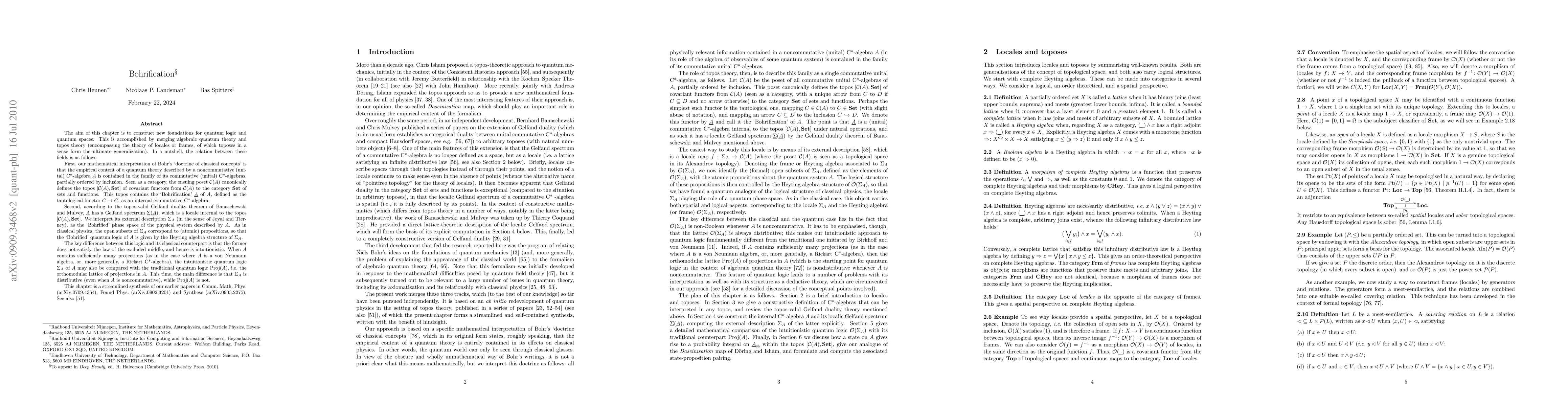 This paper constructs new foundations for quantum logic and quantum spaces by merging algebraic quantum theory and topos theory, introducing a "Bohrification" process that transforms noncommutative C*-algebras into internal commutative C*-algebras within a topos. The resulting intuitionistic quantum logic differs from classical logic by not satisfying the law of the excluded middle.