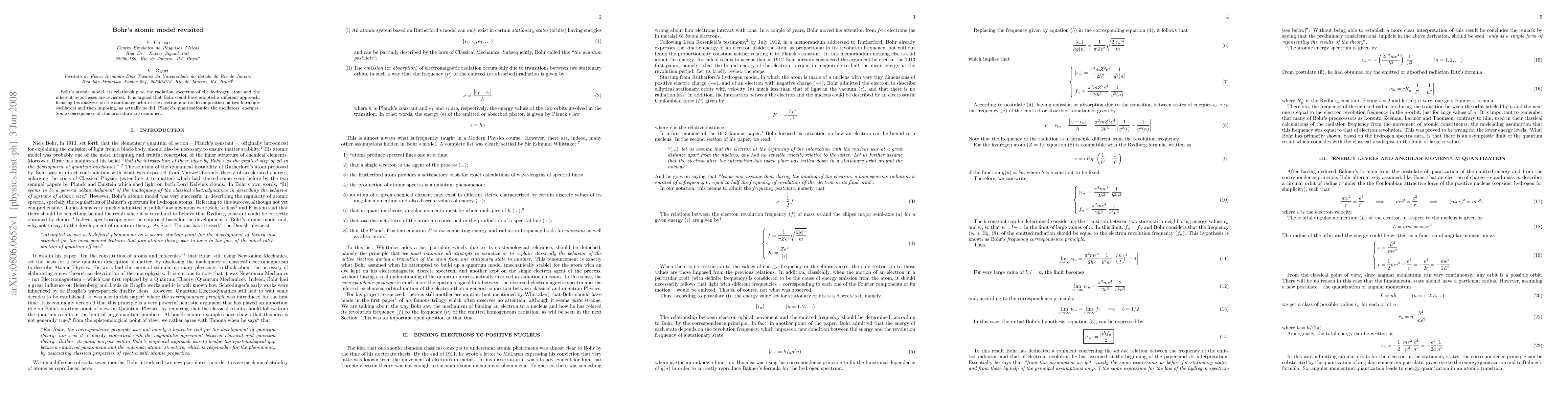 This paper revisits Bohr's atomic model, suggesting an alternative approach focusing on the electron's stationary orbit decomposed into harmonic oscillators, followed by the imposition of Planck's quantization. The implications of this alternative method are explored.