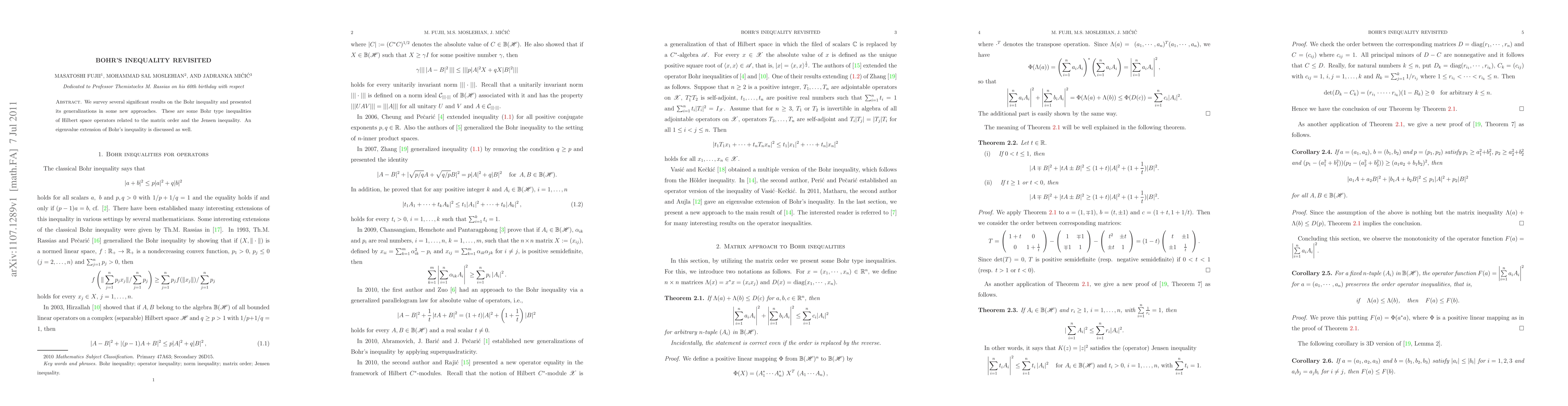 Summary: This paper surveys significant results and generalizations of Bohr's inequality, including its application to Hilbert space operators, matrix orders, and the Jensen inequality, as well as an extension involving eigenvalues.