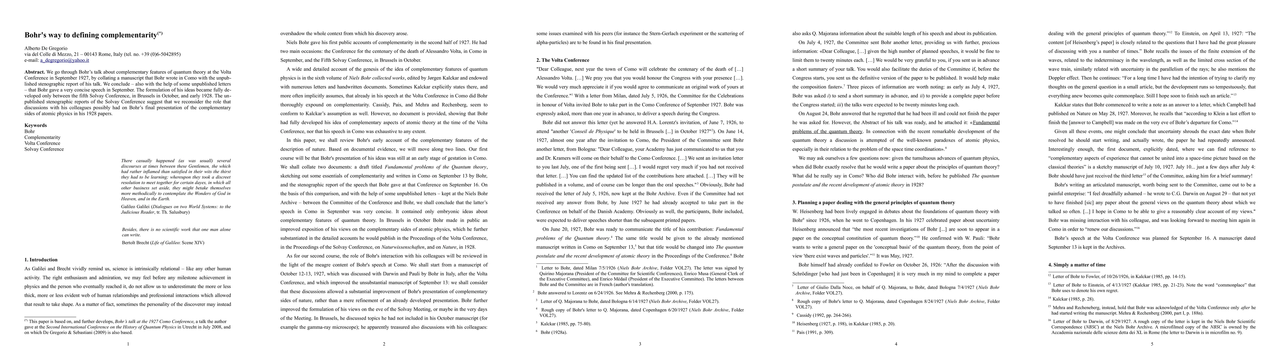 We go through Bohr's talk about complementary features of quantum theory at the Volta Conference in September 1927, by collating a manuscript that Bohr wrote in Como with the unpublished stenographic report of his talk. We conclude - also with the help of some unpublished letters - that Bohr gave a very concise speech in September. The formulation of his ideas became fully developed only between the fifth Solvay Conference, in Brussels in October, and early 1928. The unpublished stenographic reports of the Solvay Conference suggest that we reconsider the role that discussions with his colleagues possibly had on Bohr's final presentation of the complementary sides of atomic physics in his 1928 papers.