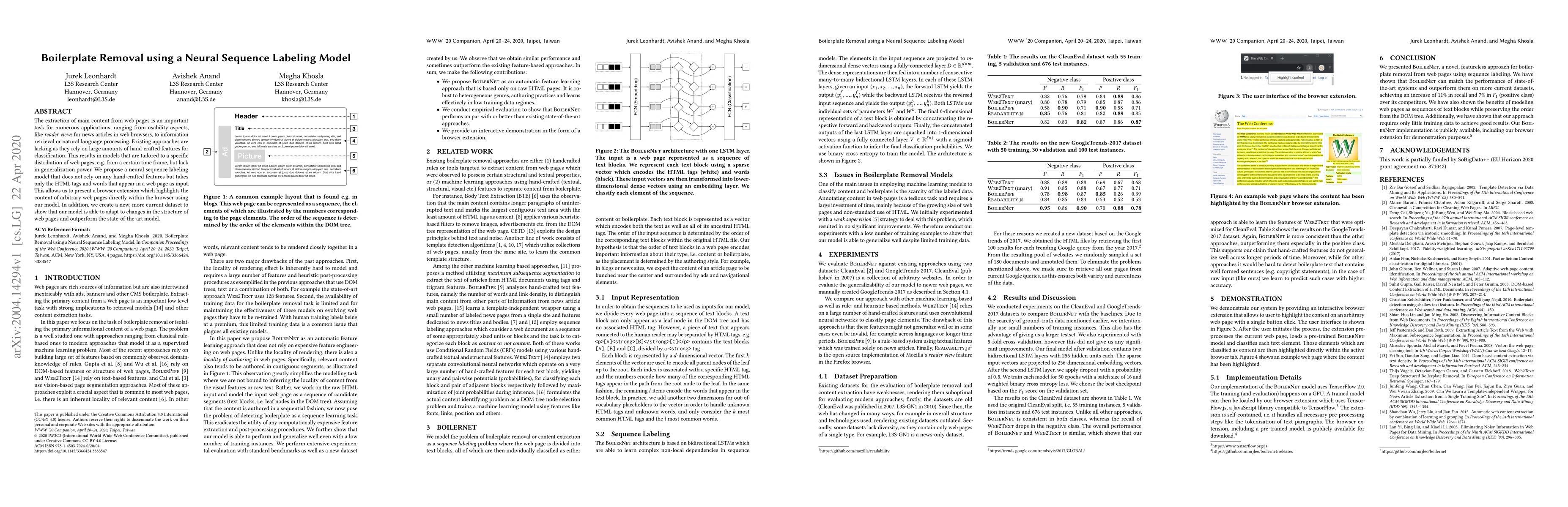 This paper proposes a neural sequence labeling model for boilerplate removal from web pages, eliminating the need for hand-crafted features and enabling better generalization. The model uses only HTML tags and words, and a new dataset demonstrates its superior performance over existing methods.