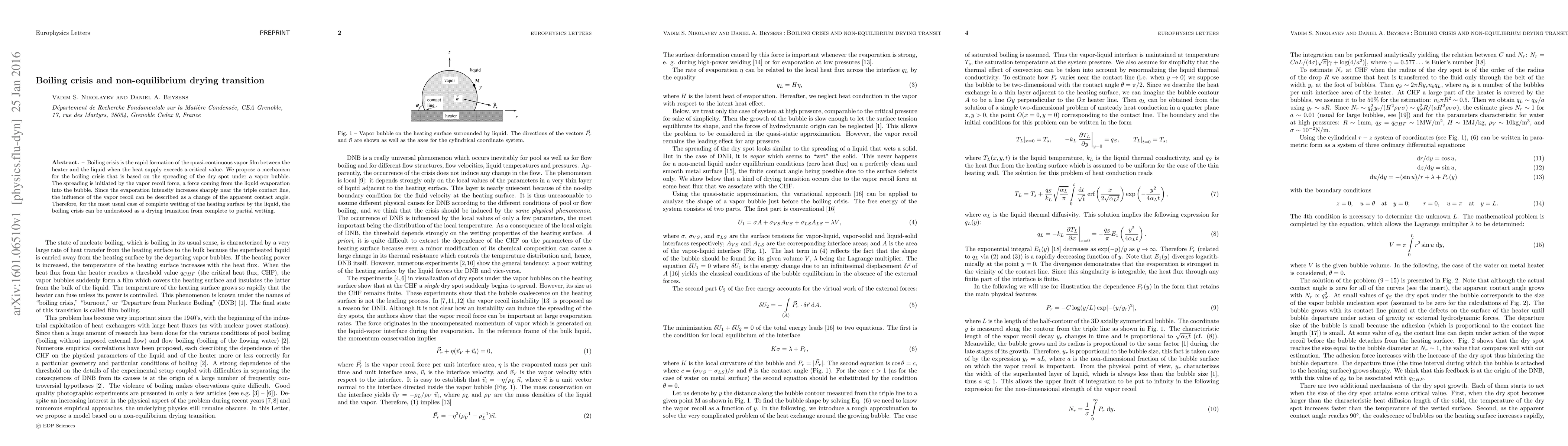 Boiling crisis is the rapid formation of the quasi-continuous vapor film between the heater and the liquid when the heat supply exceeds a critical value. We propose a mechanism for the boiling crisis that is based on the spreading of the dry spot under a vapor bubble. The spreading is initiated by the vapor recoil force, a force coming from the liquid evaporation into the bubble. Since the evaporation intensity increases sharply near the triple contact line, the influence of the vapor recoil can be described as a change of the apparent contact angle. Therefore, for the most usual case of complete wetting of the heating surface by the liquid, the boiling crisis can be understood as a drying transition from complete to partial wetting. The state of nucleate boiling, which is boiling in its usual sense, is characterized by a very large rate of heat transfer from the heating surface to the bulk because the superheated liquid is carried away from the heating surface by the departing vapor bubbles. If the heating power is increased, the temperature of the heating surface increases with the heat flux. When the heat flux from the heater reaches a threshold value q CHF (the critical heat flux, CHF), the vapor bubbles suddenly form a film which covers the heating surface and insulates the latter from the bulk of the liquid. The temperature of the heating surface grows so rapidly that the heater can fuse unless its power is controlled. This phenomenon is known under the names of "boiling crisis," "burnout," or "Departure from Nucleate Boiling" (DNB) [1]. The final state of this transition is called film boiling. This problem has become very important since the 1940's, with the beginning of the industrial exploitation of heat exchangers with large heat fluxes (as with nuclear power stations). Since then a huge amount of research has been done for the various conditions of pool boiling (boiling without imposed external flow) and flow boiling (boiling of the flowing water) [2]. Numerous empirical correlations have been proposed, each describing the dependence of the CHF on the physical parameters of the liquid and of the heater more or less correctly for a particular geometry and particular conditions of boiling [2]. A strong dependence of the threshold on the details of the experimental setup coupled with difficulties in separating the consequences of DNB from its causes is at the origin of a large number of frequently controversial hypotheses [2]. The violence of boiling makes observations quite difficult. Good quality photographic experiments are presented in only a few articles (see e.g. [3] -- [6]). Despite an increasing interest in the physical aspect of the problem during recent years [7,8] and numerous empirical approaches, the underlying physics still remains obscure. In this Letter, we propose a model based on a non-equilibrium drying transition.