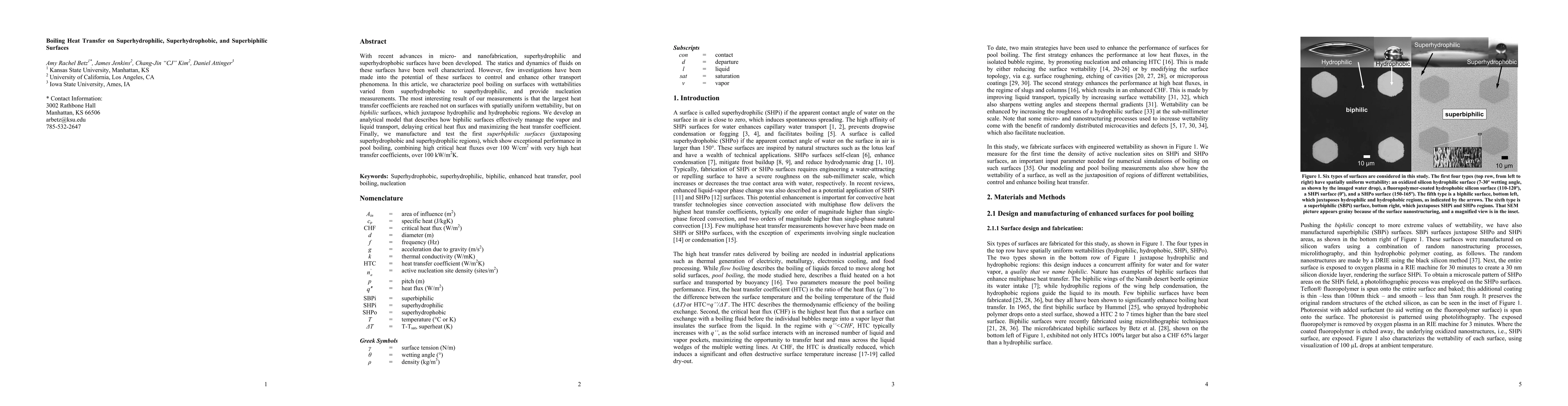This paper investigates the boiling heat transfer on superhydrophilic, superhydrophobic, and superbiphilic surfaces, finding that biphilic surfaces, which combine hydrophilic and hydrophobic regions, achieve the highest heat transfer coefficients and critical heat fluxes. An analytical model explains how biphilic surfaces optimize vapor and liquid transport, leading to superior pool boiling performance.