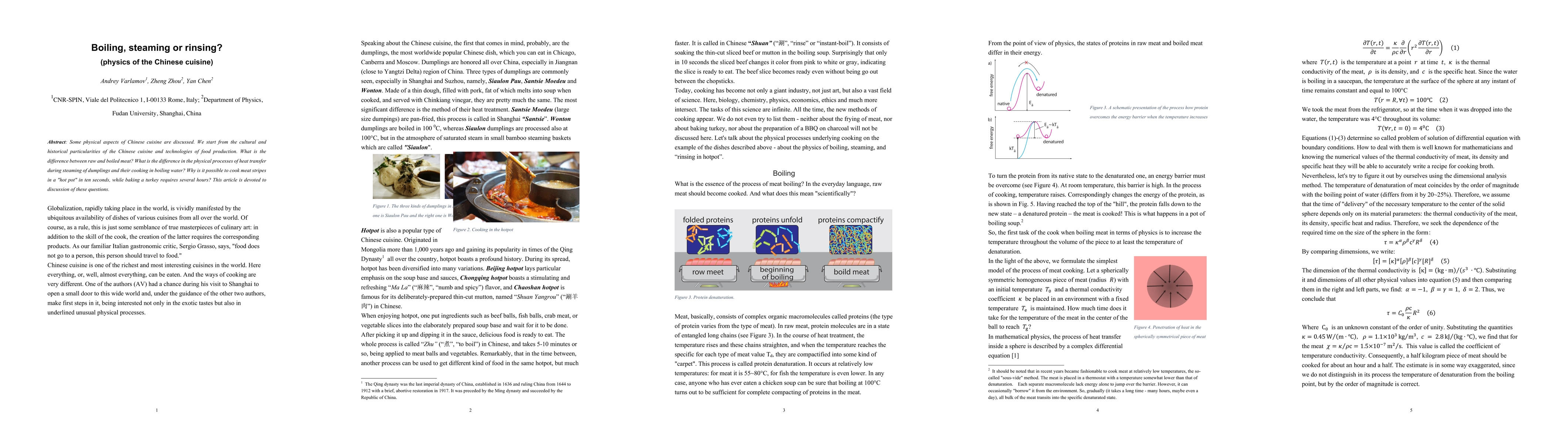 Some physical aspects of Chinese cuisine are discussed. We start from the cultural and historical particularities of the Chinese cuisine and technologies of food production. What is the difference between raw and boiled meat? What is the difference in the physical processes of heat transfer during steaming of dumplings and their cooking in boiling water? Why is it possible to cook meat stripes in a "hot pot" in ten seconds, while baking a turkey requires several hours? This article is devoted to discussion of these questions.