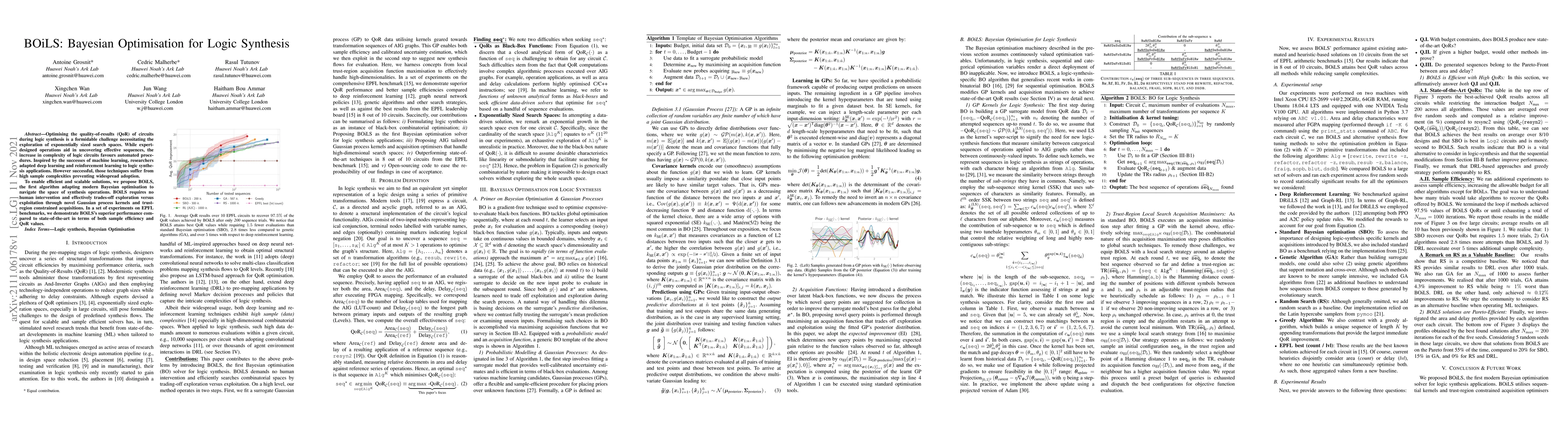 BOiLS employs Bayesian optimisation to enhance the quality-of-results in logic synthesis, balancing exploration and exploitation with novel Gaussian process kernels. Experiments show BOiLS outperforms existing methods in sample efficiency and synthesis outcomes on EPFL benchmarks.