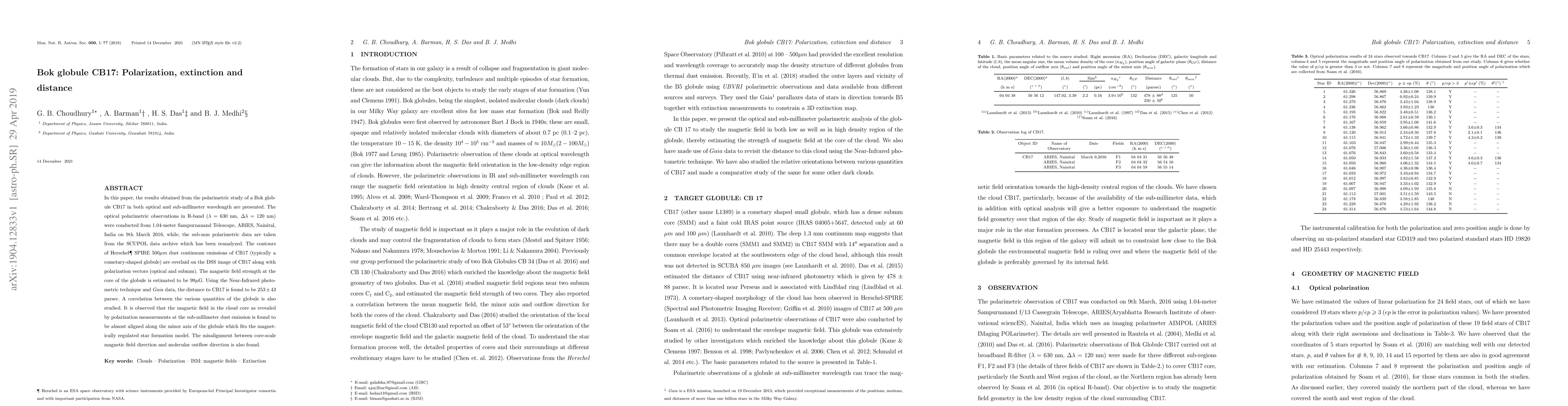 In this paper, the results obtained from the polarimetric study of a Bok globule CB17 in both optical and sub-millimeter wavelength are presented. The optical polarimetric observations in R-band ($\lambda$ = 630 nm, $\Delta \lambda$ = 120 nm) were conducted from 1.04-meter Sampurnanand Telescope, ARIES, Nainital, India on 9th March 2016, while, the sub-mm polarimetric data are taken from the SCUPOL data archive which has been reanalyzed. The contours of Herschel\footnote{Herschel is an ESA space observatory with science instruments provided by European-led Principal Investigator consortia and with important participation from NASA.} SPIRE 500$\mu m$ dust continuum emissions of CB17 (typically a cometary-shaped globule) are overlaid on the DSS image of CB17 along with polarization vectors (optical and submm). The magnetic field strength at the core of the globule is estimated to be $99\mu$G. Using the Near-Infrared photometric technique and \emph{Gaia} data, the distance to CB17 is found to be $253 \pm 43$ parsec. A correlation between the various quantities of the globule is also studied. It is observed that the magnetic field in the cloud core as revealed by polarization measurements at the sub-millimeter dust emission is found to be almost aligned along the minor axis of the globule which fits the magnetically regulated star formation model. The misalignment between core-scale magnetic field direction and molecular outflow direction is also found.