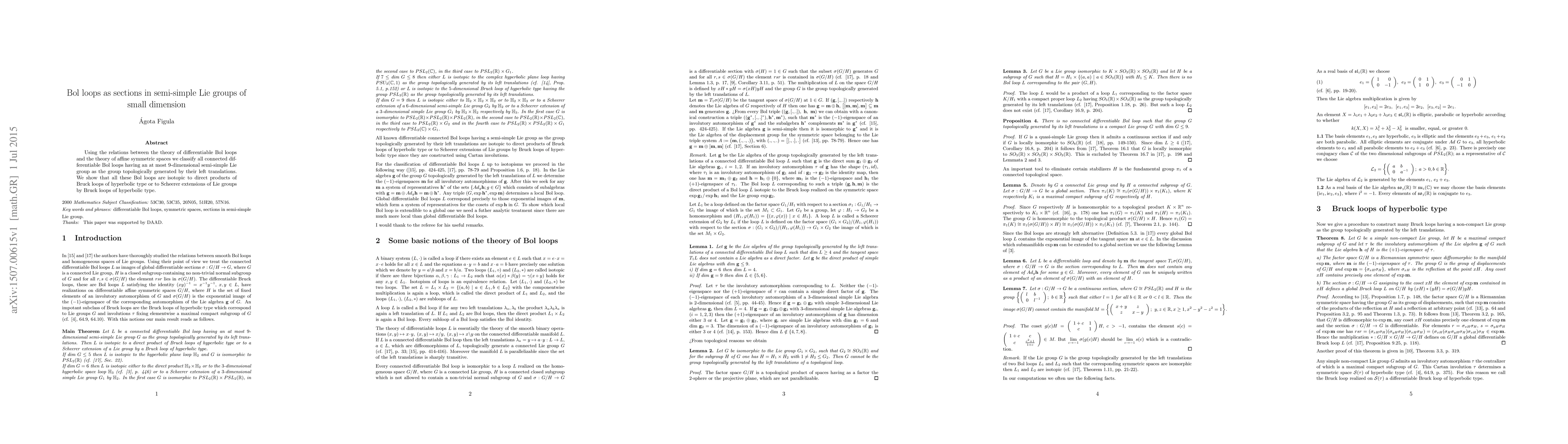 Using the relations between the theory of differentiable Bol loops and the theory of affine symmetric spaces we classify all connected differentiable Bol loops having an at most $9$-dimensional semi-simple Lie group as the group topologically generated by their left translations. We show that all these Bol loops are isotopic to direct products of Bruck loops of hyperbolic type or to Scheerer extensions of Lie groups by Bruck loops of hyperbolic type.