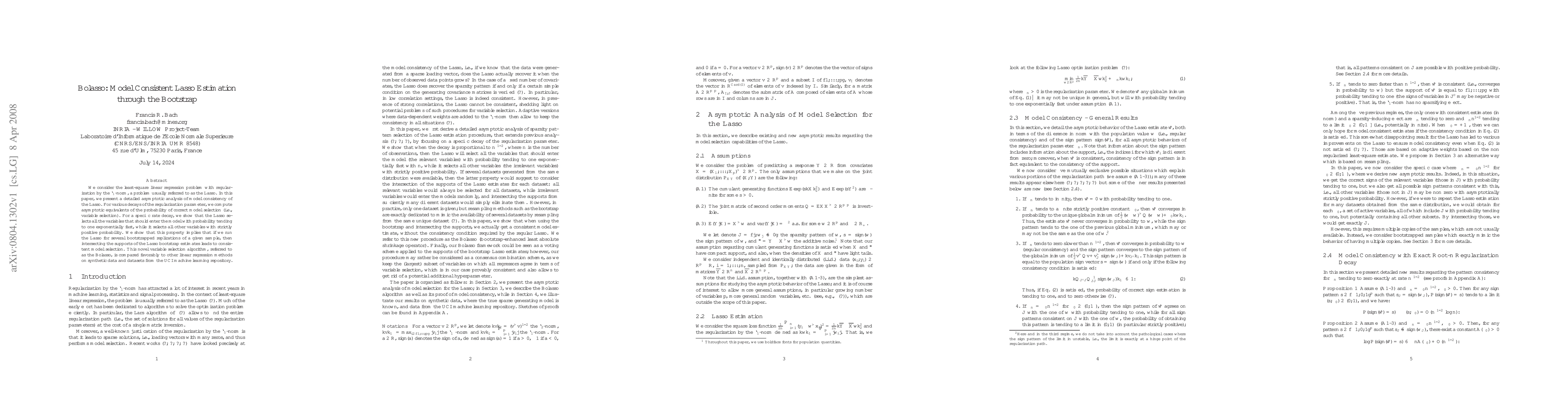 The Bolasso method is proposed for consistent variable selection in Lasso regression through the bootstrap. It demonstrates superior performance in model consistency compared to other linear regression techniques, as shown through synthetic and real-world datasets.