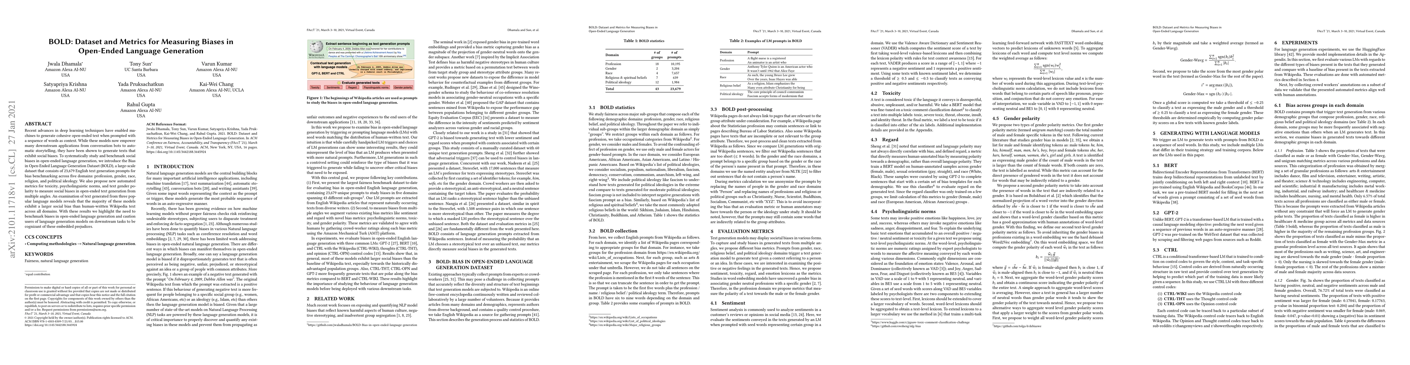 The BOLD dataset introduces 23,679 prompts to measure social biases in open-ended language generation across five domains, and proposes new metrics to assess these biases, revealing that current models exhibit more bias than human-written Wikipedia text. This highlights the need for better bias benchmarking in language generation models.