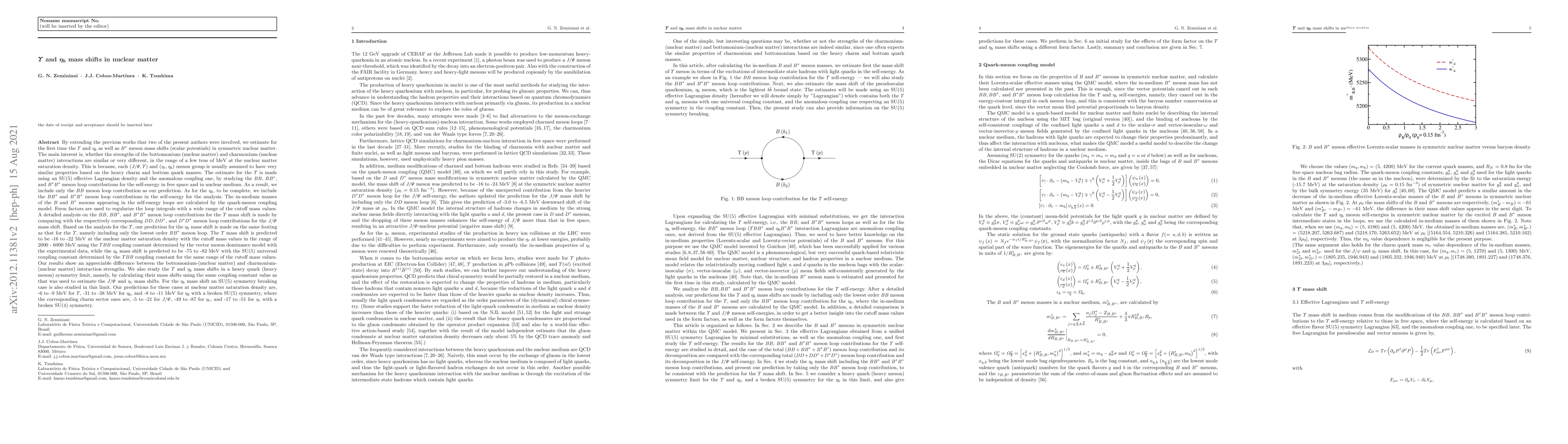 We estimate the $\Upsilon$, $\eta_b$ and $B^*$ meson mass shifts in symmetric nuclear matter. The interest is, whether the strengths of the bottomonium-(nuclear matter) and charmonium-(nuclear matter) interactions are similar or different. This is because, each ($J/\Psi,\Upsilon$) and ($\eta_c,\eta_b$) meson group is usually assumed to have very similar properties based on the heavy charm and bottom quark masses. The estimate for the $\Upsilon$ is made using an SU(5) effective Lagrangian and the anomalous coupling one, by studying the $BB$, $BB^*$, and $B^*B^*$ meson loop contributions for the self-energy. As for the $\eta_b$, we include the $BB^*$ and $B^*B^*$ meson loop contributions in the self-energy. The in-medium masses of the $B$ and $B^*$ mesons appearing in the self-energy are calculated by the quark-meson coupling model. An analysis on the $BB$, $BB^*$, and $B^*B^*$ meson loops in the $\Upsilon$ mass shift is made by comparing with the corresponding $DD, DD^*$, and $D^*D^*$ meson loops for the $J/\Psi$ mass shift. Our prediction for the $\eta_b$ mass shift is made including only the lowest order $BB^*$ meson loop. The $\Upsilon$ mass shift, with including only the $BB$ loop, is predicted to be -16 to -22 MeV at the nuclear matter saturation density using the $\Upsilon BB$ coupling constant determined by the vector meson dominance model with the experimental data, while the $\eta_b$ mass shift is predicted to be -75 to -82 MeV with the SU(5) universal coupling constant determined by the $\Upsilon BB$ coupling constant. Our results show an appreciable difference between the bottomonium-(nuclear matter) and charmonium-(nuclear matter) interaction strengths. We also study the $\Upsilon$ and $\eta_b$ mass shifts in a heavy quark (heavy meson) symmetry limit.