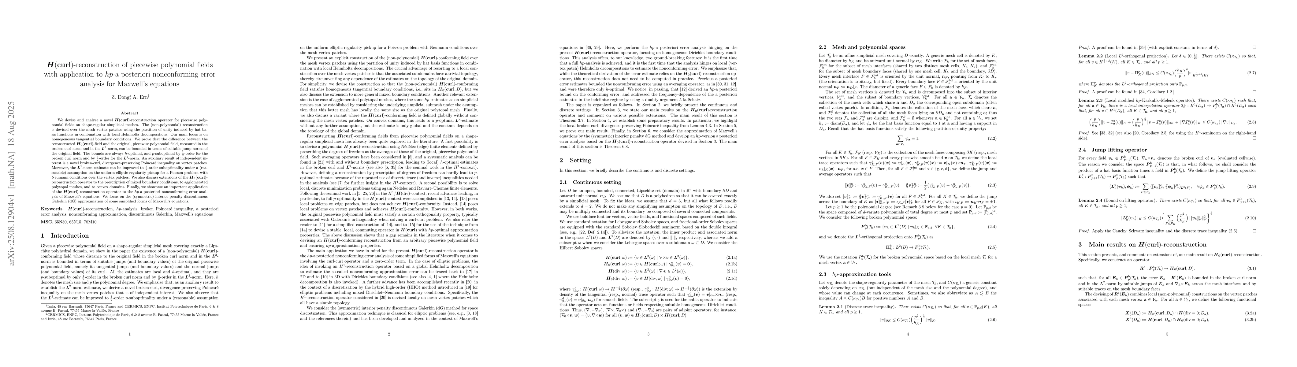 We devise and analyse a novel $\boldsymbol{H}(\textbf{curl})$-reconstruction operator for piecewise polynomial fields on shape-regular simplicial meshes. The (non-polynomial) reconstruction is devised over the mesh vertex patches using the partition of unity induced by hat basis functions in combination with local Helmholtz decompositions. Our main focus is on homogeneous tangential boundary conditions. We prove that the difference between the reconstructed $\boldsymbol{H}_0(\textbf{curl})$-field and the original, piecewise polynomial field, measured in the broken curl norm and in the $\boldsymbol{L}^2$-norm, can be bounded in terms of suitable jump norms of the original field. The bounds are always $h$-optimal, and $p$-suboptimal by $\frac12$-order for the broken curl norm and by $\frac32$-order for the $\boldsymbol{L}^2$-norm. An auxiliary result of independent interest is a novel broken-curl, divergence-preserving Poincar\'{e} inequality on vertex patches. Moreover, the $\boldsymbol{L}^2$-norm estimate can be improved to $\frac12$-order suboptimality under a (reasonable) assumption on the uniform elliptic regularity pickup for a Poisson problem with Neumann conditions over the vertex patches. We also discuss extensions of the $\boldsymbol{H}_0(\textbf{curl})$-reconstruction operator to the prescription of mixed boundary conditions, to agglomerated polytopal meshes, and to convex domains. Finally, we showcase an important application of the $\boldsymbol{H}(\textbf{curl})$-reconstruction operator to the $hp$-a posteriori nonconforming error analysis of Maxwell's equations. We focus on the (symmetric) interior penalty discontinuous Galerkin (dG) approximation of some simplified forms of Maxwell's equations.