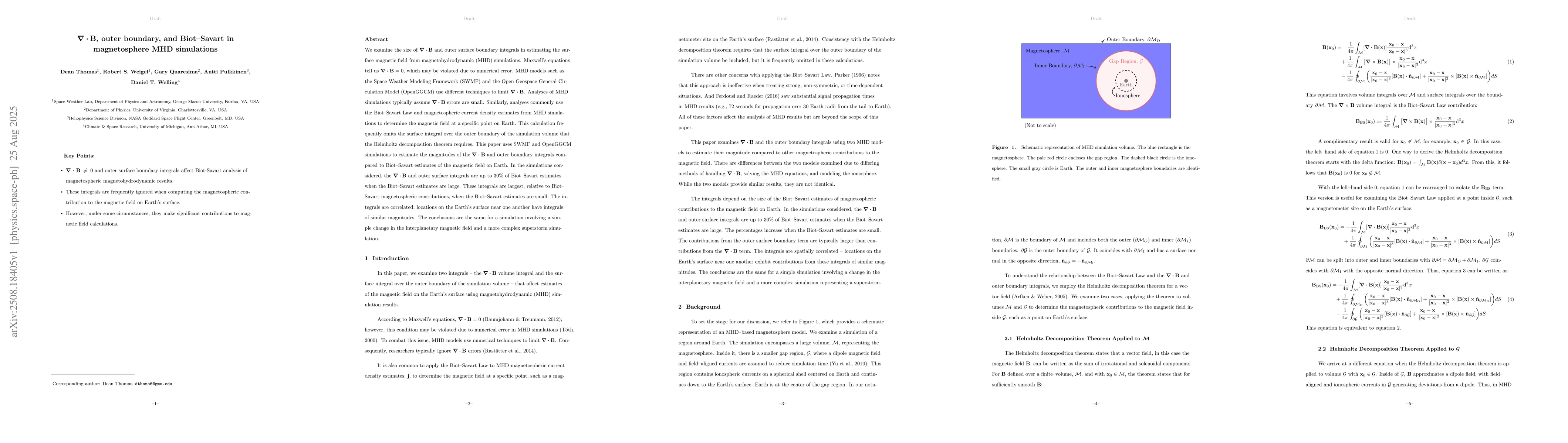We examine the size of $\boldsymbol{\nabla} \boldsymbol{\cdot} \mathbf{B}$ and outer surface boundary integrals in estimating the surface magnetic field from magnetohydrodynamic (MHD) simulations. Maxwell's equations tell us $\boldsymbol{\nabla} \boldsymbol{\cdot} \mathbf{B}$ = 0, which may be violated due to numerical error. MHD models, such as the Space Weather Modeling Framework (SWMF) and the Open Geospace General Circulation Model (OpenGGCM), use different techniques to limit $\boldsymbol{\nabla} \boldsymbol{\cdot} \mathbf{B}$. Analyses of MHD simulations typically assume $\boldsymbol{\nabla} \boldsymbol{\cdot} \mathbf{B}$ errors are small. Similarly, analyses commonly use the Biot-Savart Law and magnetospheric current density estimates from MHD simulations to determine the magnetic field at a specific point on Earth. This calculation frequently omits the surface integral over the outer boundary of the simulation volume that the Helmholtz decomposition theorem requires. This paper uses SWMF and OpenGGCM simulations to estimate the magnitudes of the $\boldsymbol{\nabla} \boldsymbol{\cdot} \mathbf{B}$ and outer boundary integrals compared to Biot-Savart estimates of the magnetic field on Earth. In the simulations considered, the $\boldsymbol{\nabla} \boldsymbol{\cdot} \mathbf{B}$ and outer surface integrals are up to 30 percent of Biot-Savart estimates when the Biot-Savart estimates are large. These integrals are largest, relative to Biot-Savart magnetospheric contributions, when the Biot-Savart estimates are small. The integrals are correlated; locations on the Earth's surface near one another have integrals of similar magnitudes. The conclusions are the same for a simulation involving a simple change in the interplanetary magnetic field and a more complex superstorm simulation.