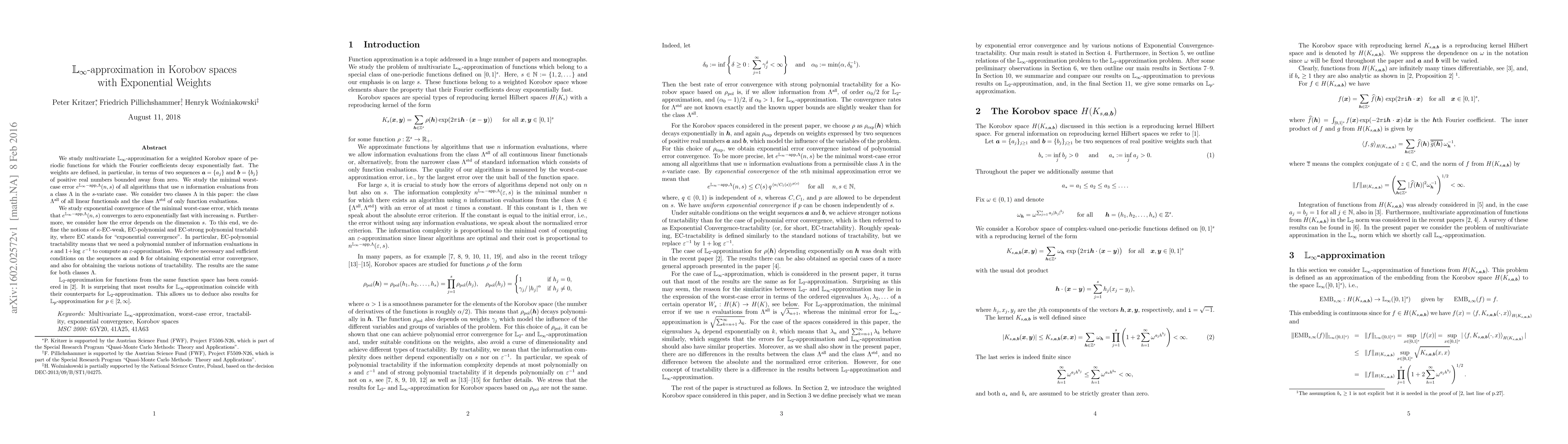 We study multivariate $\boldsymbol{L}_{\infty}$-approximation for a weighted Korobov space of periodic functions for which the Fourier coefficients decay exponentially fast. The weights are defined, in particular, in terms of two sequences $\boldsymbol{a}=\{a_j\}$ and $\boldsymbol{b}=\{b_j\}$ of positive real numbers bounded away from zero. We study the minimal worst-case error $e^{\boldsymbol{L}_{\infty}\mathrm{-app},\Lambda}(n,s)$ of all algorithms that use $n$ information evaluations from a class $\Lambda$ in the $s$-variate case. We consider two classes $\Lambda$ in this paper: the class $\Lambda^{{\rm all}}$ of all linear functionals and the class $\Lambda^{{\rm std}}$ of only function evaluations. We study exponential convergence of the minimal worst-case error, which means that $e^{\boldsymbol{L}_{\infty}\mathrm{-app},\Lambda}(n,s)$ converges to zero exponentially fast with increasing $n$. Furthermore, we consider how the error depends on the dimension $s$. To this end, we define the notions of $\kappa$-EC-weak, EC-polynomial and EC-strong polynomial tractability, where EC stands for "exponential convergence". In particular, EC-polynomial tractability means that we need a polynomial number of information evaluations in $s$ and $1+\log\,\varepsilon^{-1}$ to compute an $\varepsilon$-approximation. We derive necessary and sufficient conditions on the sequences $\boldsymbol{a}$ and $\boldsymbol{b}$ for obtaining exponential error convergence, and also for obtaining the various notions of tractability. The results are the same for both classes $\Lambda$.