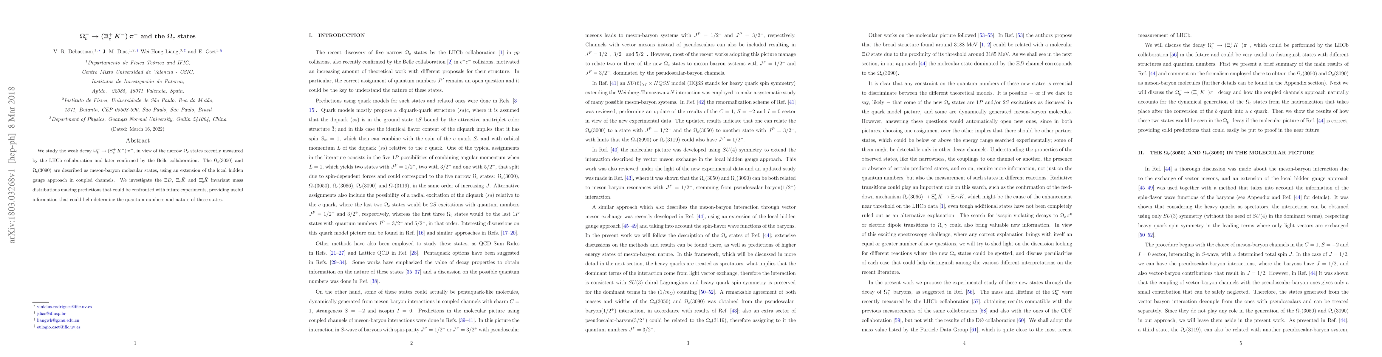 We study the weak decay $\Omega_b^- \to (\Xi_c^+ \, K^-) \, \pi^-$, in view of the narrow $\Omega_c$ states recently measured by the LHCb collaboration and later confirmed by the Belle collaboration. The $\Omega_c(3050)$ and $\Omega_c(3090)$ are described as meson-baryon molecular states, using an extension of the local hidden gauge approach in coupled channels. We investigate the $\Xi D$, $\Xi_c \bar K$ and $\Xi_c^\prime \bar K$ invariant mass distributions making predictions that could be confronted with future experiments, providing useful information that could help determine the quantum numbers and nature of these states.