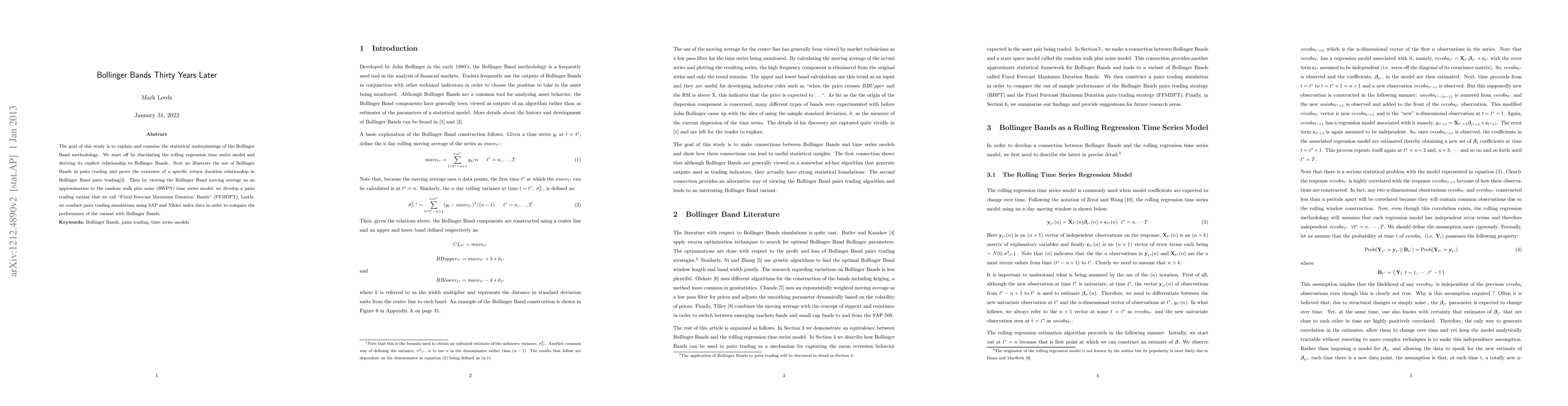 The goal of this study is to explain and examine the statistical underpinnings of the Bollinger Band methodology. We start off by elucidating the rolling regression time series model and deriving its explicit relationship to Bollinger Bands. Next we illustrate the use of Bollinger Bands in pairs trading and prove the existence of a specific return duration relationship in Bollinger Band pairs trading.Then by viewing the Bollinger Band moving average as an approximation to the random walk plus noise (RWPN) time series model, we develop a pairs trading variant that we call "Fixed Forecast Maximum Duration' Bands" (FFMDPT). Lastly, we conduct pairs trading simulations using SAP and Nikkei index data in order to compare the performance of the variant with Bollinger Bands.