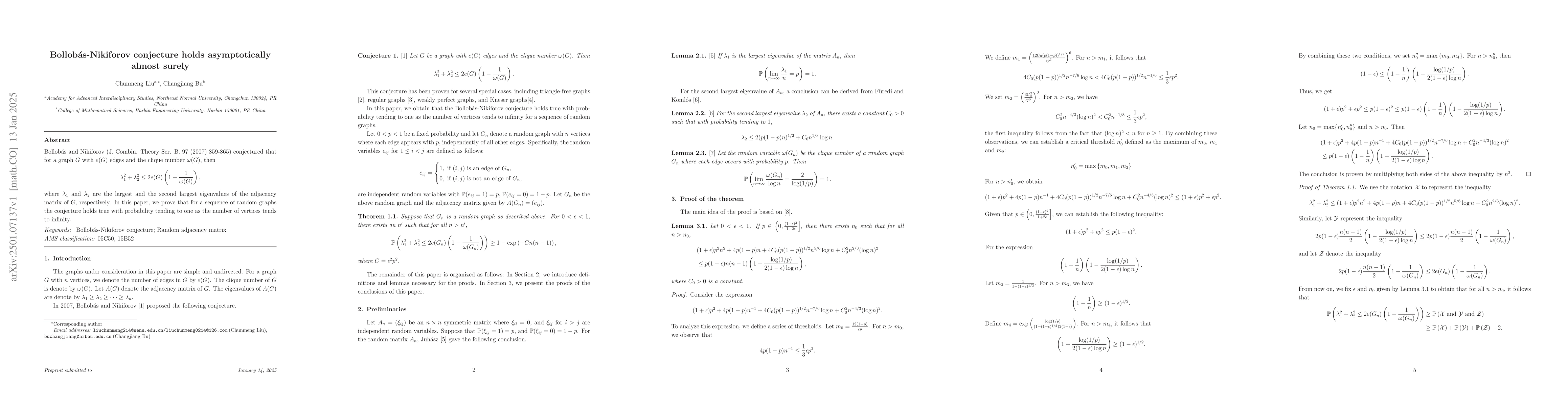 The Bollobás-Nikiforov conjecture posits an upper bound on the sum of the squares of the two largest eigenvalues of a graph's adjacency matrix in relation to its edge count and clique number. This paper proves the conjecture holds asymptotically almost surely for large random graphs.