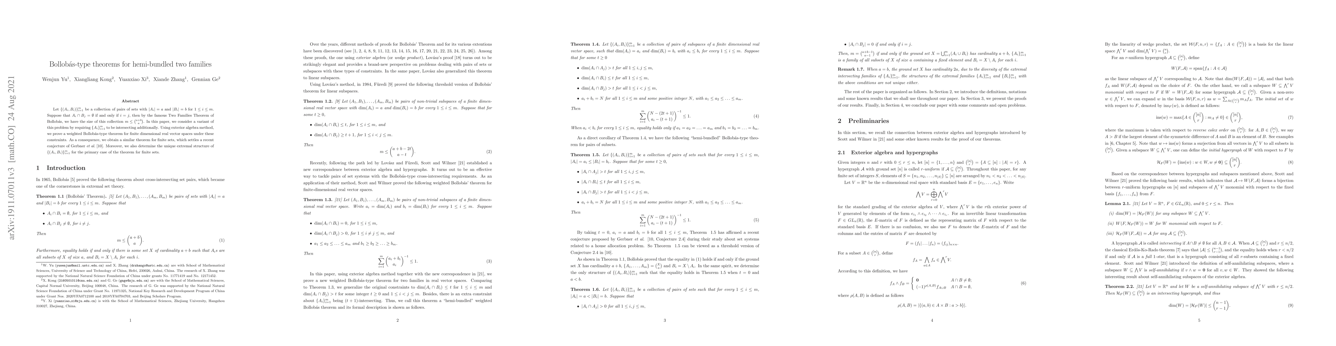 Let $\{(A_i,B_i)\}_{i=1}^{m}$ be a collection of pairs of sets with $|A_i|=a$ and $|B_i|=b$ for $1\leq i\leq m$. Suppose that $A_i\cap B_j=\emptyset$ if and only if $i=j$, then by the famous Bollob\'{a}s theorem, we have the size of this collection $m\leq {a+b\choose a}$. In this paper, we consider a variant of this problem by setting $\{A_i\}_{i=1}^{m}$ to be intersecting additionally. Using exterior algebra method, we prove a weighted Bollob\'{a}s type theorem for finite dimensional real vector spaces under these constraints. As a consequence, we have a similar theorem for finite sets, which settles a recent conjecture of Gerbner et. al \cite{GKMNPTX2019}. Moreover, we also determine the unique extremal structure of $\{(A_i,B_i)\}_{i=1}^{m}$ for the primary case of the theorem for finite sets.