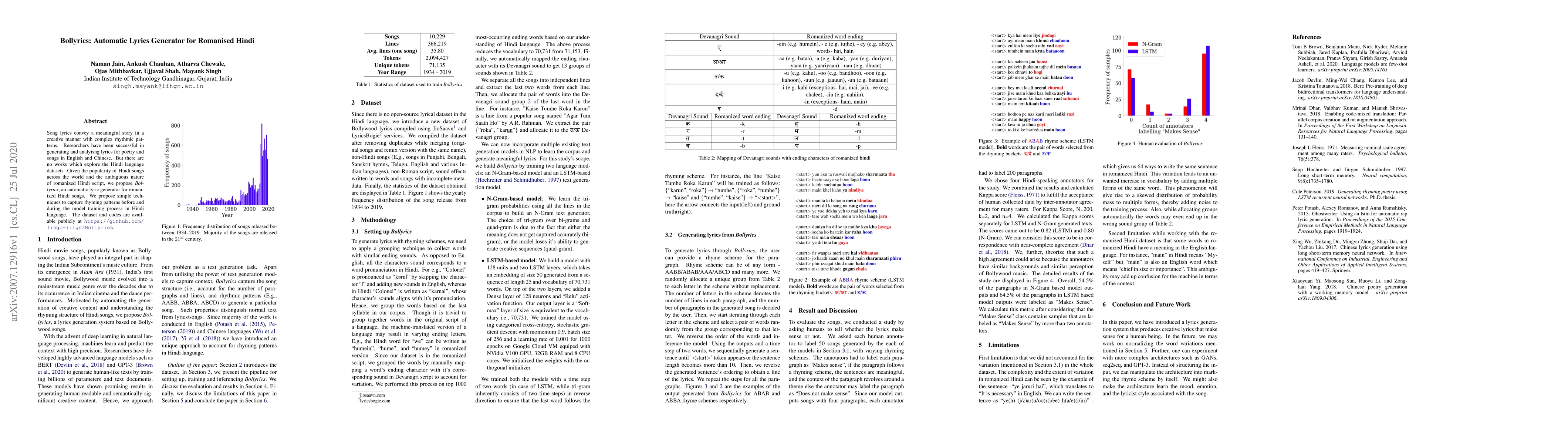 The paper introduces Bollyrics, an automatic lyric generator for romanized Hindi songs using N-Gram and LSTM-based text generation models. It groups words based on the last syllable in the corpus, mapping Devanagari sounds to Romanized endings to handle variations. Two models are trained: an N-Gram model learning tri-gram probabilities and an LSTM model with 128 units and two layers.