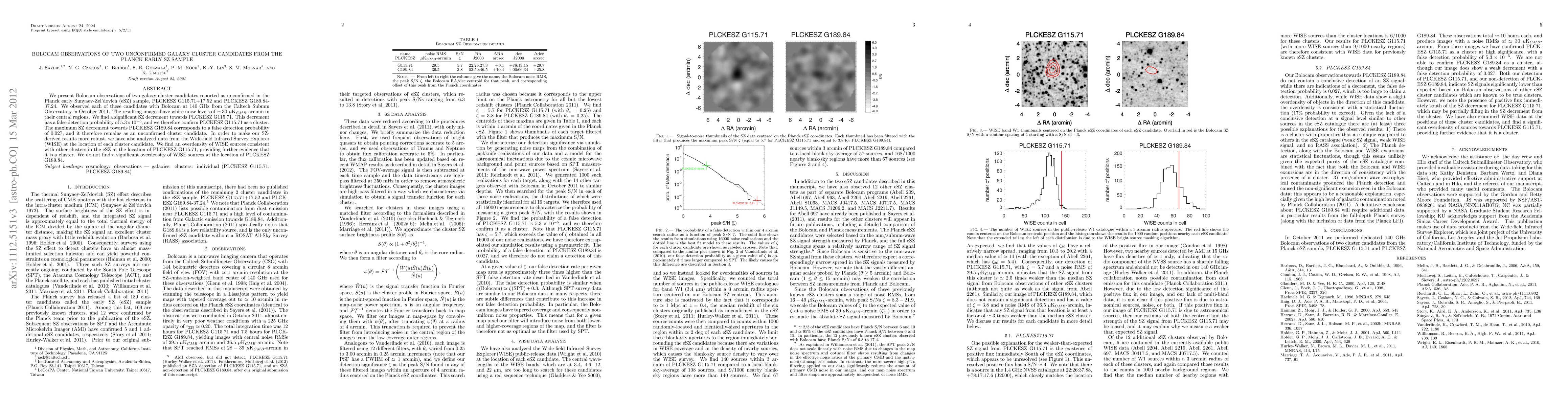 We present Bolocam observations of two galaxy cluster candidates reported as unconfirmed in the Planck early Sunyaev-Zel'dovich (eSZ) sample, PLCKESZ G115.71+17.52 and PLCKESZ G189.84-37.24. We observed each of these candidates with Bolocam at 140 GHz from the Caltech Submm Observatory in October 2011. The resulting images have white noise levels of ~30 {\mu}KCMB-arcmin in their central regions. We find a significant SZ decrement towards PLCKESZ G115.71. This decrement has a false detection probability of 5.3\times10-5, and we therefore confirm PLCKESZ G115.71 as a cluster. The maximum SZ decrement towards PLCKESZ G189.84 corresponds to a false detection probability of 0.027, and it therefore remains as an unconfirmed cluster candidate. In order to make our SZ-derived results more robust, we have also analyzed data from the Wide-field Infrared Survey Explorer (WISE) at the location of each cluster candidate. We find an overdensity of WISE sources consistent with other clusters in the eSZ at the location of PLCKESZ G115.71, providing further evidence that it is a cluster. We do not find a significant overdensity of WISE sources at the location of PLCKESZ G189.84.
