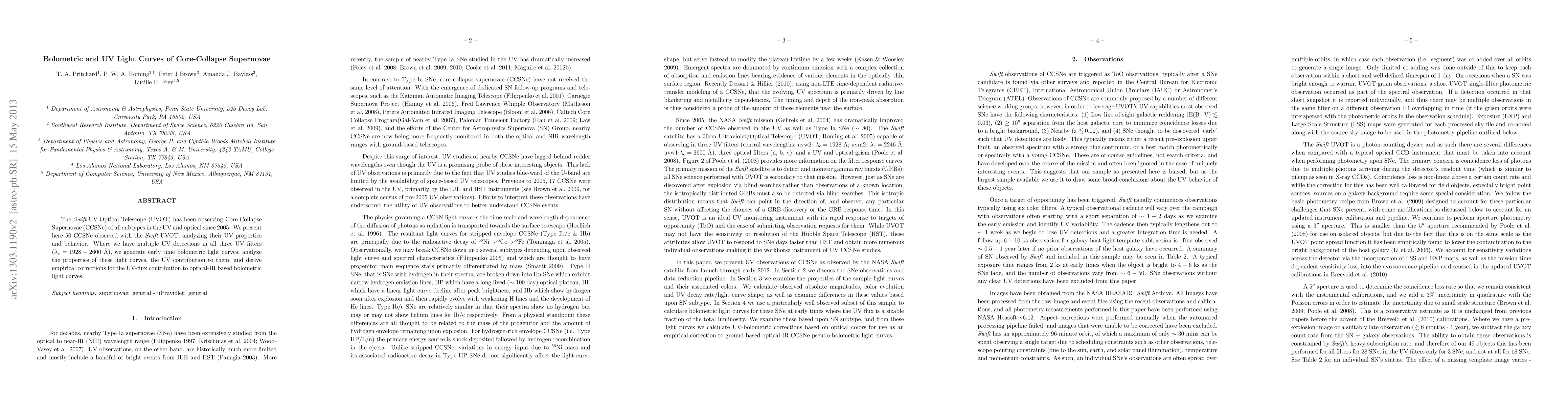 The research utilized Swift UVOT observations of 50 Core-Collapse Supernovae (CCSNe) of all subtypes to analyze their UV properties and behavior, generating early-time bolometric light curves and deriving empirical corrections for UV-flux contribution to optical-IR based bolometric light curves.