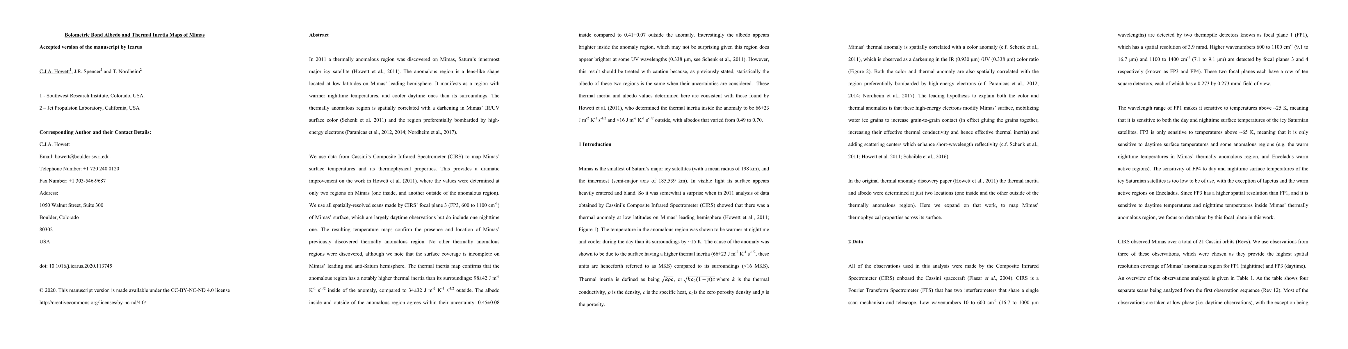 We use data from Cassini's Composite Infrared Spectrometer CIRS to map Mimas' surface temperatures and its thermophysical properties. This provides a dramatic improvement on the work in Howett et al. (2011), where the values were determined at only two regions on Mimas (one inside, and another outside of the anomalous region). We use all spatially-resolved scans made by CIRS' focal plane 3 (FP3, 600 to 1100 cm-1) of Mimas' surface, which are largely daytime observations but do include one nighttime one. The resulting temperature maps confirm the presence and location of Mimas' previously discovered thermally anomalous region. No other thermally anomalous regions were discovered, although we note that the surface coverage is incomplete on Mimas' leading and anti-Saturn hemisphere. The thermal inertia map confirms that the anomalous region has a notably higher thermal inertia than its surroundings: 98 +/- 42 J m-2 K-1 s-1/2 inside of the anomaly, compared to 34 +/- 32 J m-2 K-1 s-1/2 outside. The albedo inside and outside of the anomalous region agrees within their uncertainty: 0.45+/-0.08 inside compared to 0.41 +/- 0.07 outside the anomaly. Interestingly the albedo appears brighter inside the anomaly region, which may not be surprising given this region does appear brighter at some UV wavelengths (0.338 microns, see Schenk et al., 2011). However, this result should be treated with caution because, as previously stated, statistically the albedo of these two regions is the same when their uncertainties are considered. These thermal inertia and albedo values determined here are consistent with those found by Howett et al. (2011), who determined the thermal inertia inside the anomaly to be 66 +/- 23 J m-2 K-1 s-1/2 and less than 16 J m-2 K-1 s-1/2 outside, with albedos that varied from 0.49 to 0.70.