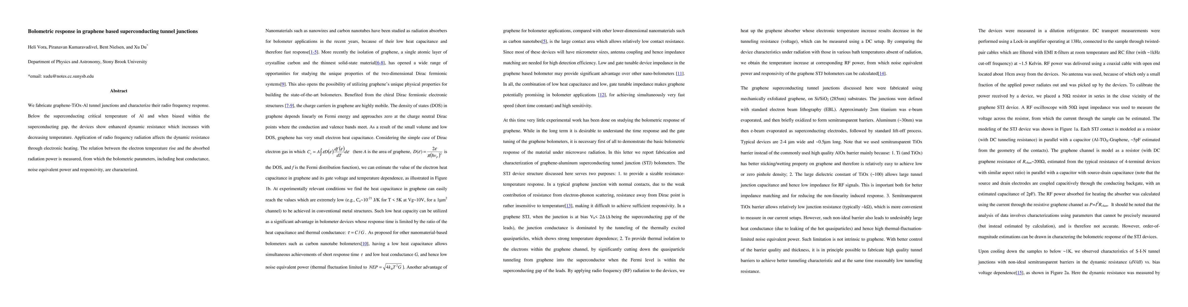 This paper investigates graphene-TiOx-Al superconducting tunnel junctions, finding enhanced dynamic resistance below the Al superconducting critical temperature. The bolometric response, including heat conductance, noise equivalent power, and responsivity, is characterized by measuring the electron temperature rise due to absorbed radio frequency radiation.