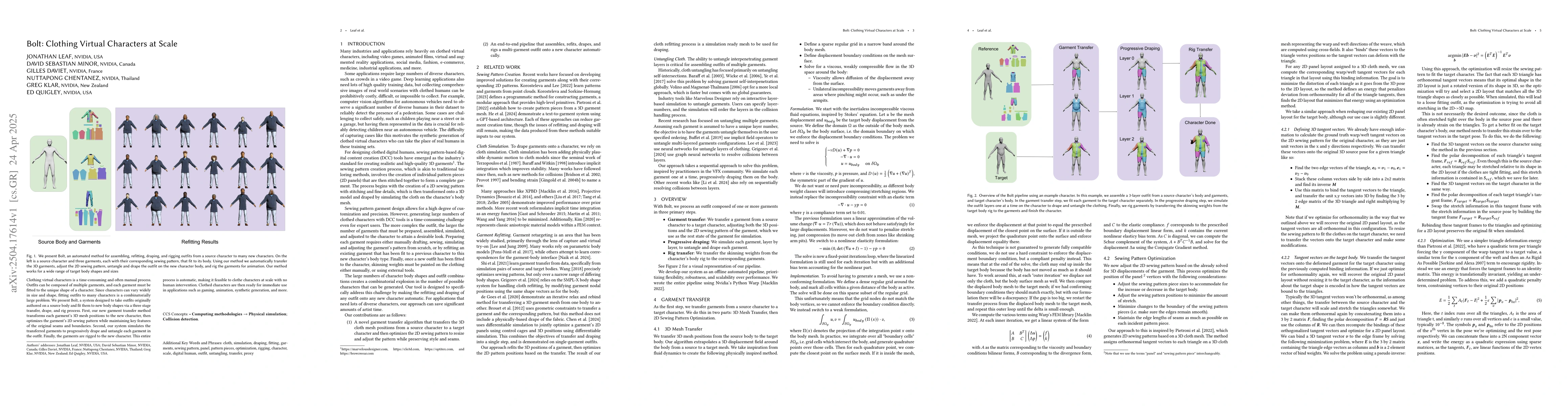 Bolt is a system that automates the process of clothing virtual characters at scale, transforming garments to fit new body shapes without human intervention.