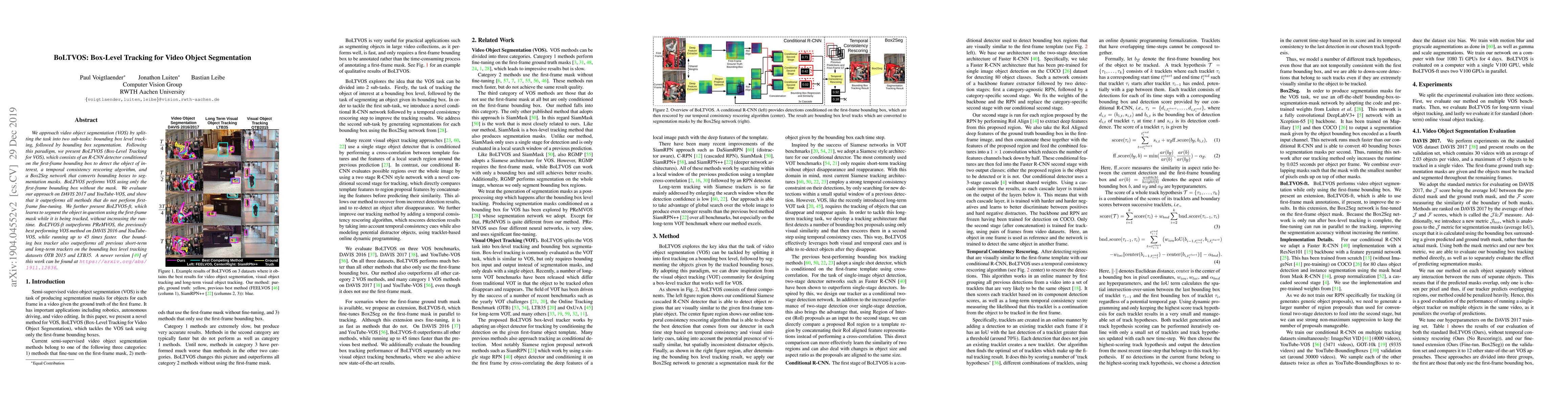 We approach video object segmentation (VOS) by splitting the task into two sub-tasks: bounding box level tracking, followed by bounding box segmentation. Following this paradigm, we present BoLTVOS (Box-Level Tracking for VOS), which consists of an R-CNN detector conditioned on the first-frame bounding box to detect the object of interest, a temporal consistency rescoring algorithm, and a Box2Seg network that converts bounding boxes to segmentation masks. BoLTVOS performs VOS using only the firstframe bounding box without the mask. We evaluate our approach on DAVIS 2017 and YouTube-VOS, and show that it outperforms all methods that do not perform first-frame fine-tuning. We further present BoLTVOS-ft, which learns to segment the object in question using the first-frame mask while it is being tracked, without increasing the runtime. BoLTVOS-ft outperforms PReMVOS, the previously best performing VOS method on DAVIS 2016 and YouTube-VOS, while running up to 45 times faster. Our bounding box tracker also outperforms all previous short-term and longterm trackers on the bounding box level tracking datasets OTB 2015 and LTB35. A newer version of this work can be found at arXiv:1911.12836.