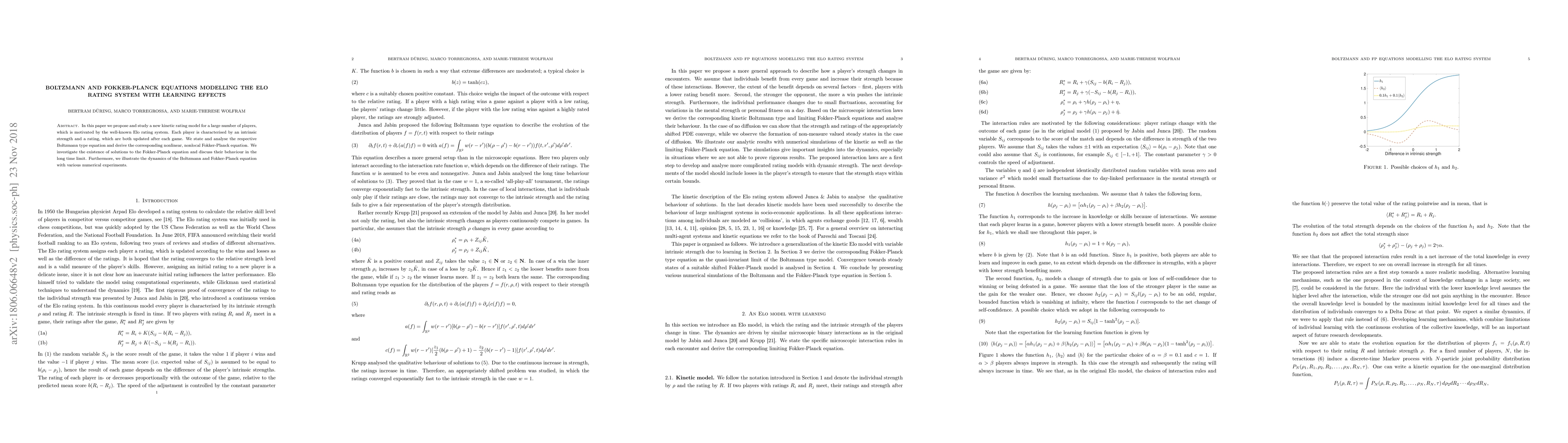 This paper proposes a kinetic rating model for the Elo rating system, deriving a Boltzmann type equation and a nonlinear, nonlocal Fokker-Planck equation to describe player strength updates. It investigates the existence and long-term behavior of solutions, and validates the model with numerical experiments.